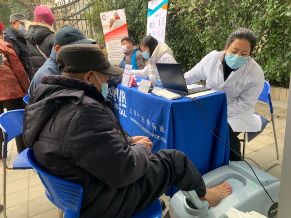 测骨密度摊位上设有专业的仪器,来自开元骨科医院社区便民服务团队的徐炎和陶小艳正在忙碌着,一上午就给66位居民完成了骨密度测试。居民把脚伸进仪器内,按摩球夹住腿部,五分钟就能检测出结果。“密度值在-2.5以下,就表明患有骨质疏松。”徐炎告诉记者,这个测试可以初步筛查出居民患有骨质疏松的风险,帮助他们及时就医。