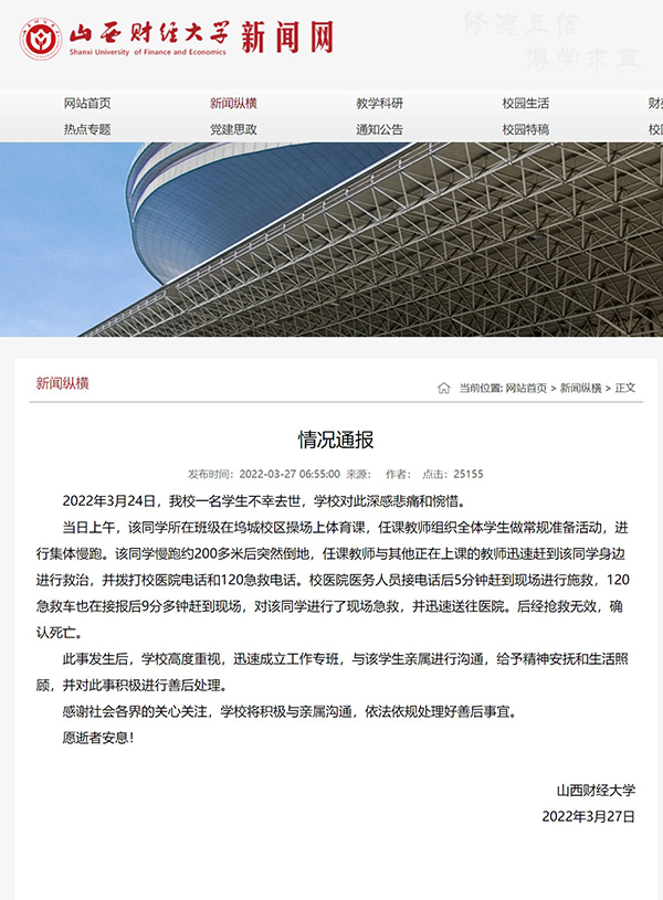 山西财经大学3月27日发布情况通报:2022年3月24日,我校一名学生不幸去世,学校对此深感悲痛和惋惜。