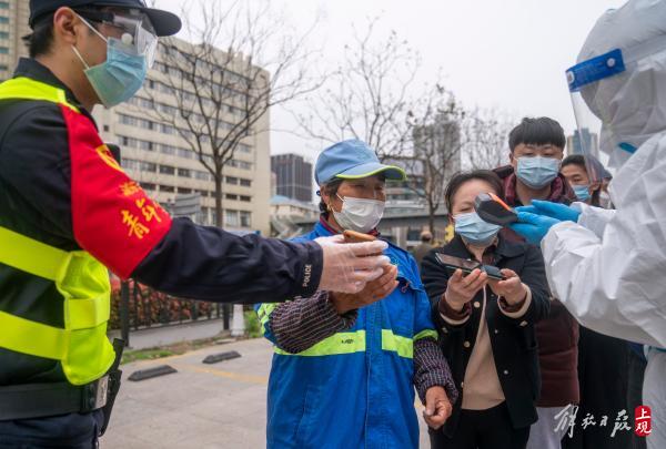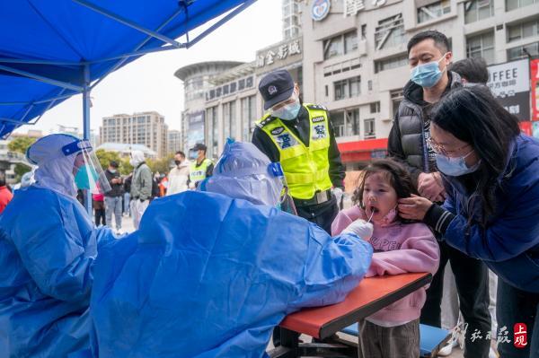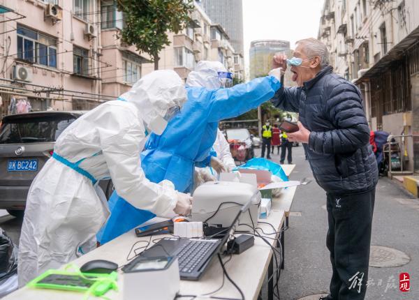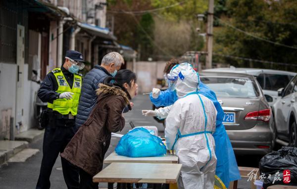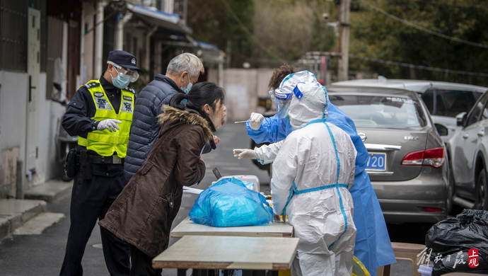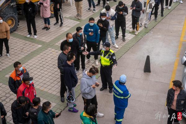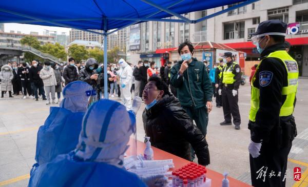 28日上午8点,微山新村小区,在浦东公安分局塘桥派出所民警和社区志愿者的有序引导下,小区居民按楼幢分批次下楼进行核酸检测。