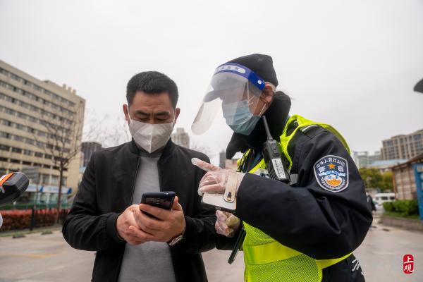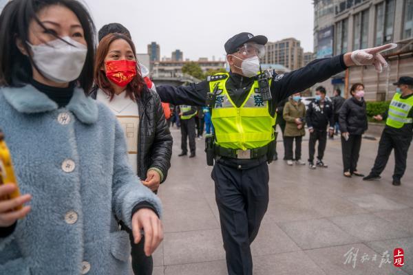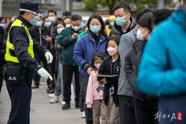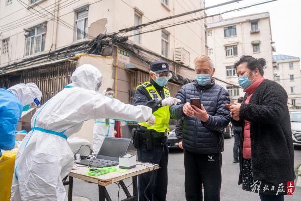 浦东公安分局塘桥派出所民警协助市民登记核酸检测相关信息,引导排队市民有序进行核酸检测。