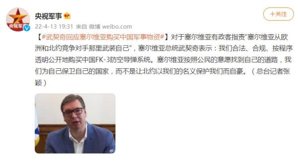 对于塞尔维亚有政客指责“塞尔维亚从欧洲和北约竞争对手那里武装自己”,塞尔维亚总统武契奇表示:我们合法、合规、按程序透明公开地购买中国FK-3防空导弹系统。塞尔维亚按照公民的意愿找到自己的道路,我们为自己保卫自己的国家,而不是让北约以我们的名义保护我们而自豪。