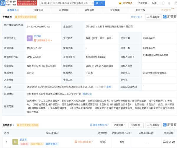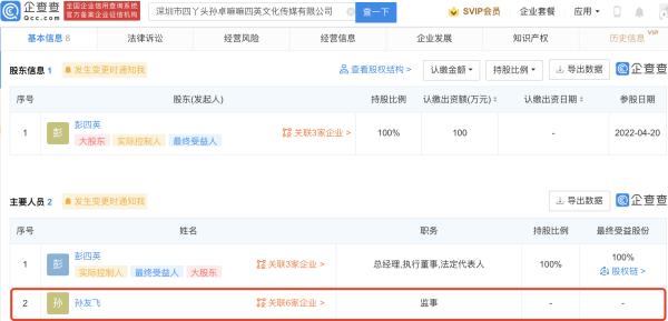 企查查APP显示,4月20日,深圳市四丫头孙卓嘛嘛四英文化传媒有限公司成立,注册资本100万元人民币,法定代表人及执行董事为彭四英(孙海洋妻子),经营范围包含:文艺创作;个人互联网直播服务;组织文化艺术交流活动;文化娱乐经纪人服务;广告发布等。企查查股权穿透显示,该公司由彭四英全资持股,孙友飞(孙海洋)任监事职位。