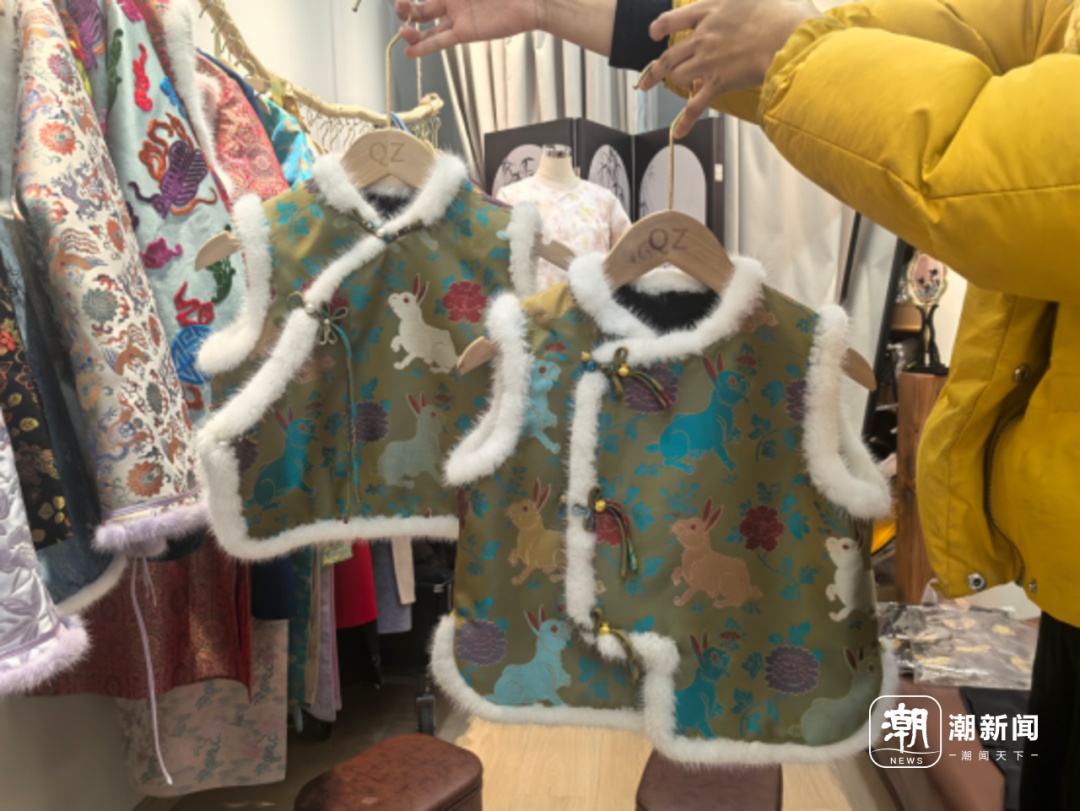 过年,生肖款的布料,也颇受顾客欢迎。不过,今年店里还没有上新蛇纹图案。“家长们喜欢为孩子挑选代表生肖的布料。”其珍介绍,“玉兔衔花”的宋锦布料是店里的常青款,选来做亲子装的顾客特别多。