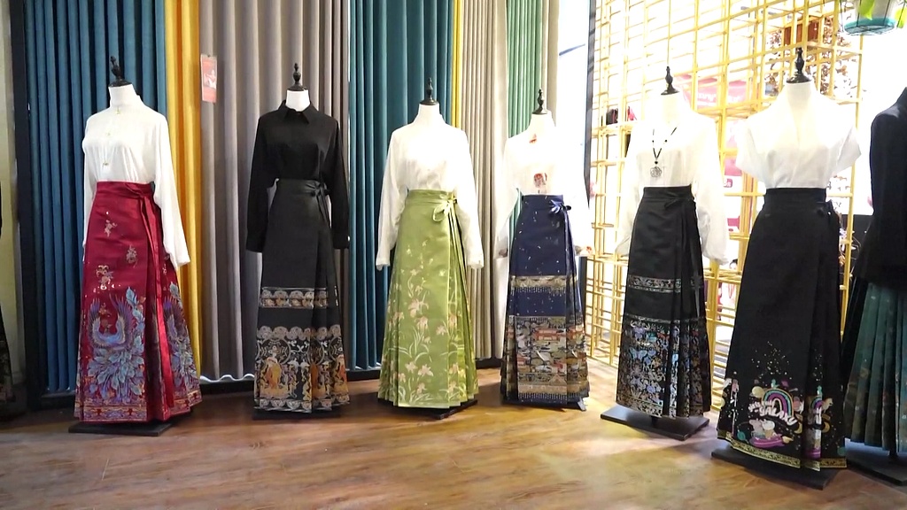 一旁正在挑选裙子的顾客小朱连连点头:“马面裙确实不错,穿着舒服又不挑身材。我上次来就买了好几条。”