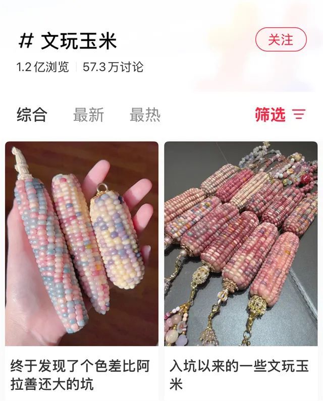 为何偏偏是玉米,而不是其他材质的农作文玩受欢迎?在中国人的共同记忆里,玉米这一家常农作物给人以朴素、真实的印象,承载着广泛的情感投射,而每根玉米独特的纹理走向和色彩渐变,满足了年轻人对“独一无二”的执着追求。这种介于“农”与“玩”之间的微妙平衡,激发了年轻人的兴趣。