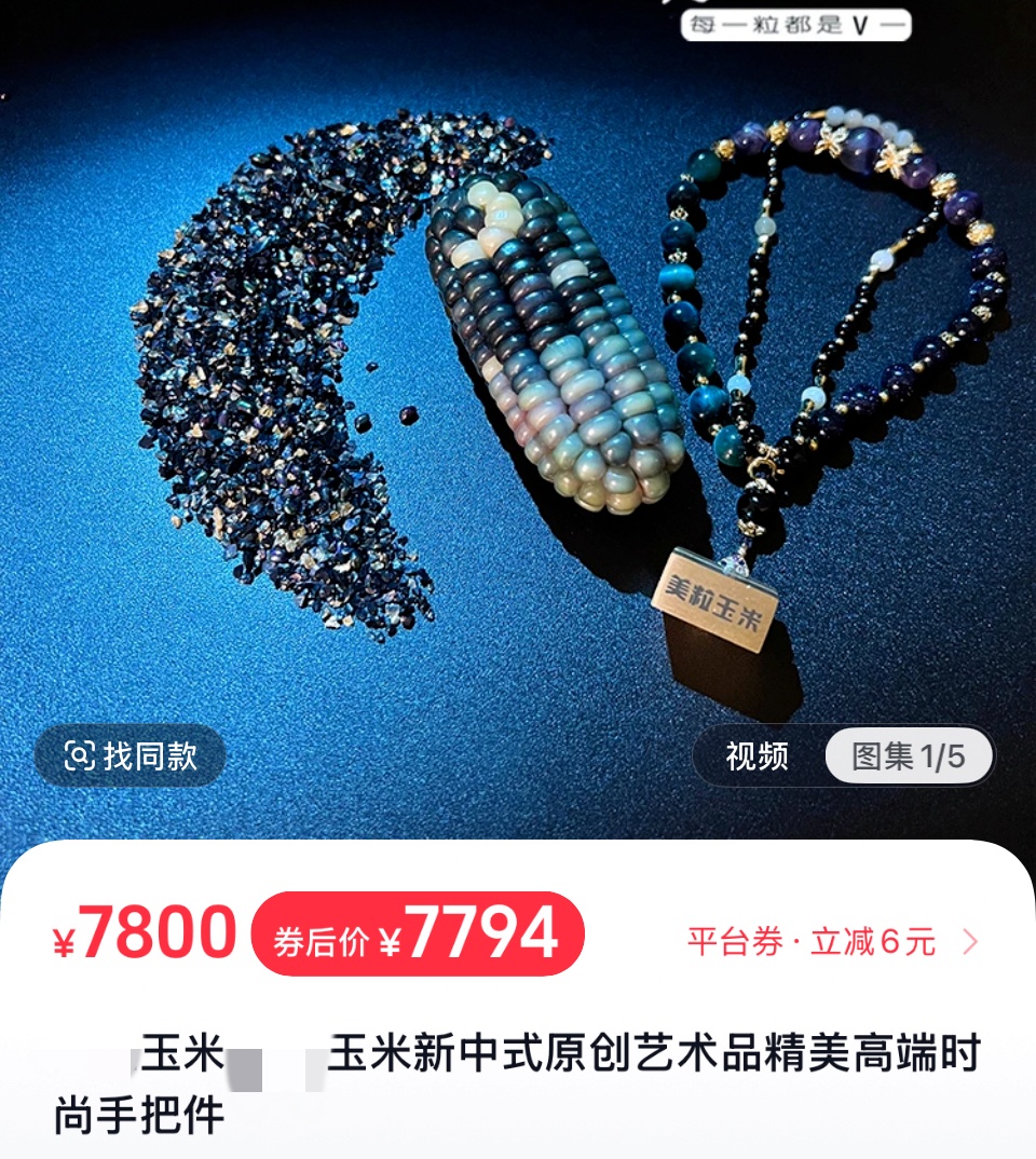目前文玩玉米没有明确的市场定价标准。在电商平台,文玩玉米价格低至十几元,高则炒到上千元甚至近万元。一家线上店,一款标上“新中式原创艺术”的文玩玉米价格为7800元,而写有“高定独特设计版”的文玩玉米,价格更是高达9800元。