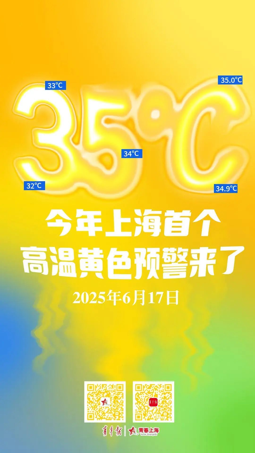 上海中心气象台2025年06月17日11时00分发布高温黄色预警信号:预计今天本市大部地区的最高气温将超过35℃,请注意用火用电安全,做好防暑防晒工作。