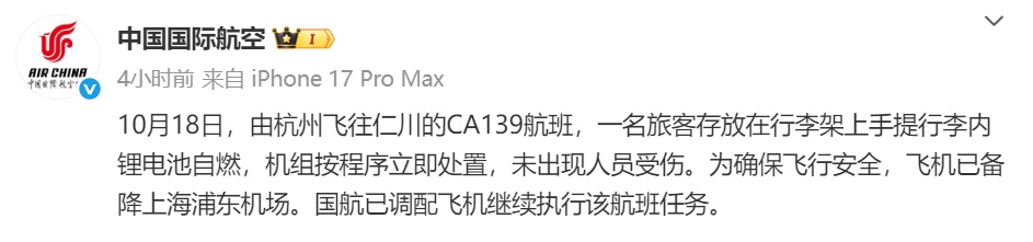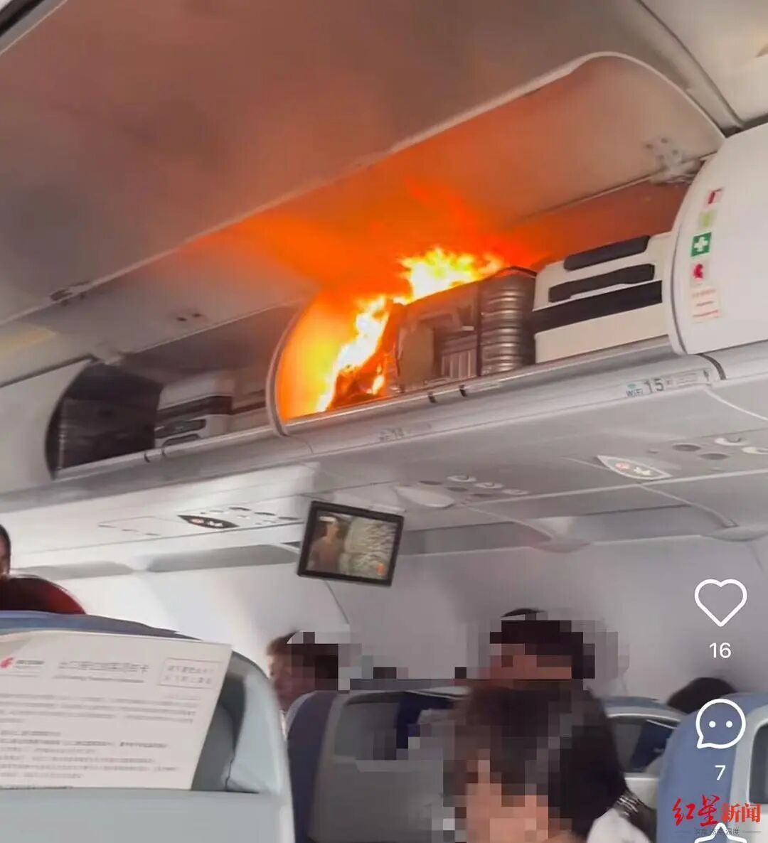 今年5月31日,在杭州飞往深圳的CZ6850航班上,一旅客携带的相机电池、充电宝出现冒烟情况,航班起飞15分钟后返航降落。