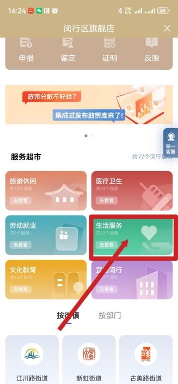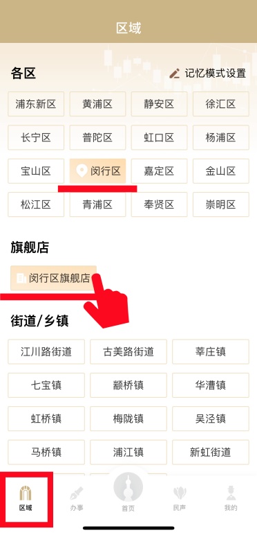 第一步:登录“随申办”市民云App由“区域”板块选择并进入“闵行区—闵行区旗舰店”;