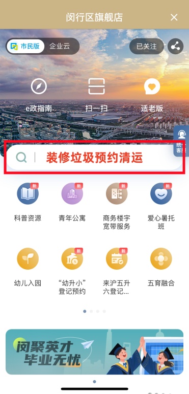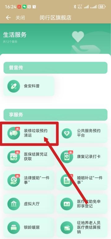 第二步:首页搜索框输入“装修垃圾预约清运”或者到“生活”栏目,找到“装修垃圾预约清运”;