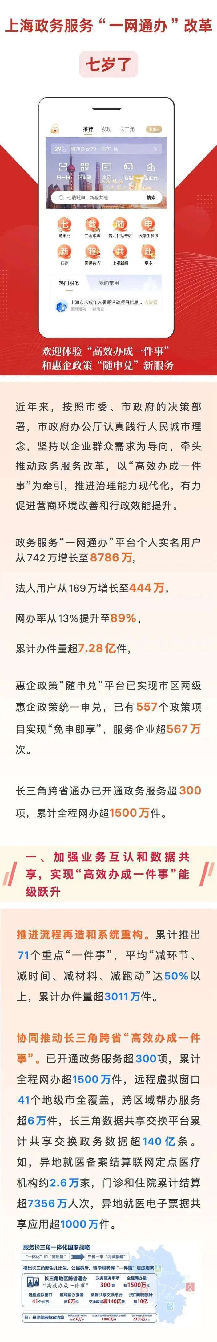 上海一网通办总门户介绍,上海政务服务“一网通办”改革7岁了!政务服务“一网通办”平台个人实名用户从742万增长至8786万,法人用户从189万增长至444万,网办率从13%提升至89%,累计办件量超7.28亿件,惠企政策“随申兑”平台已实现市区两级惠企政策统一申兑,已有557个政策项目实现“免申即享”,服务企业超567万次。长三角跨省通办已开通政务服务超300项,累计全程网办超1500万件。详见↓