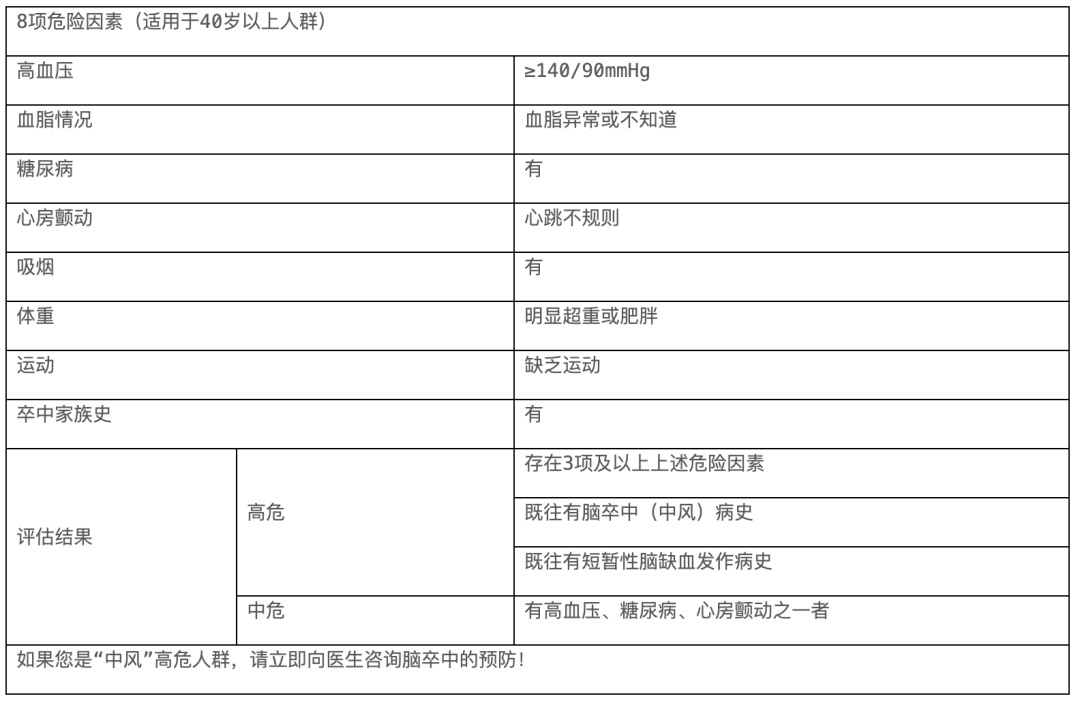 国家卫生健康委脑卒中防治工程委员会推荐40岁以上人群使用“8+2“危险评分卡进行卒中风险自我评定(见表1)。危险评分卡由8项危险因素和2项警示病史组成。