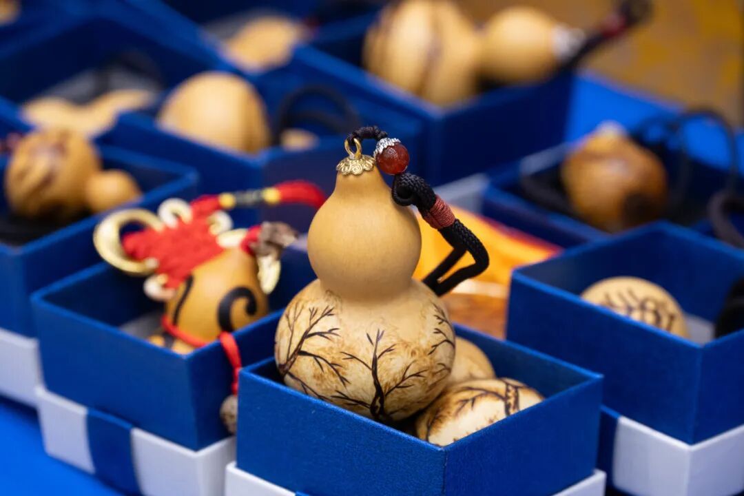 文化旅游展区里,吉林手工艺品前的赞叹声不断。“原来这就是松花江浪木根艺,有种巧夺天工的感觉。”“这也太厉害了,在这么小的葫芦上都能做出这样精细的花纹!”