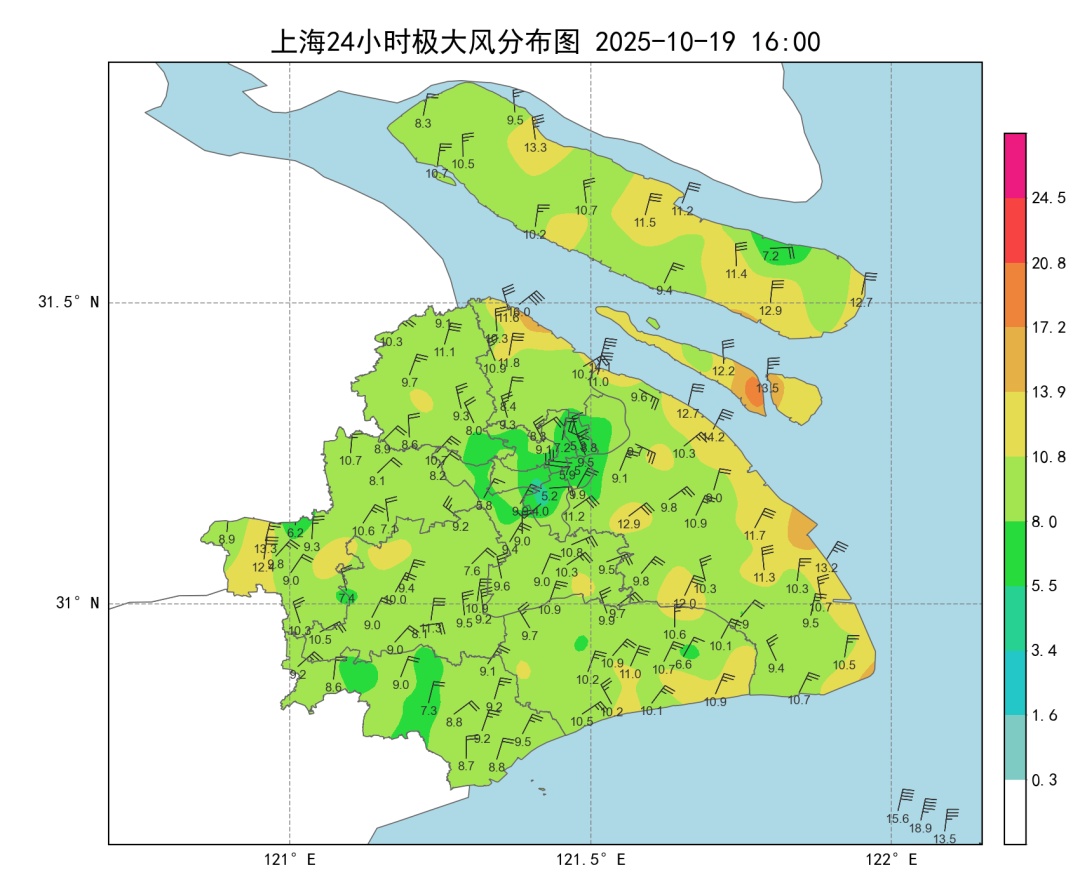 申城今天云系较多,以阴到多云为主,有些地方短时飘了些小雨。早间较凉,大部分地区的最低气温在17~20℃之间,其中徐家汇站19.3℃为最高,这也是6月12日至今129天来,徐家汇站最低气温首次降到“1”字头。白天升温乏力,徐家汇站最高气温22.4℃,风力较大,今天体感还是蛮风凉的~~外出的行人都纷纷换上了长袖长裤,不少人感慨仿佛“一夜入秋”。