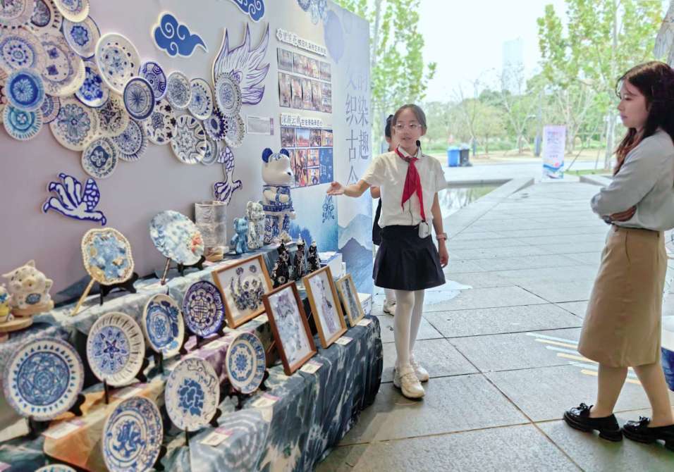 学生绘制上百个的青花瓷盘,拼成了一条栩栩如生的“中国龙”;几十件“青铜器”作品放在一起,气势如虹…… 传统艺术静态展区里,数百件青花瓷、扎染、剪纸、青铜器、编织、漂漆画、篆刻和皮影主题作品全部出自集团四所学校的学生之手,学生导览员自豪地在分类展台前为观众讲解它们的创作过程。“你猜猜这是用什么做的?”上南二村小学五年级女生孙嘉慧正向观众介绍她和同学们制作的“青铜器”:“用纸板就能做,揉、搓、捏,动作一个都不能少!颜料买不到现成的,我们自己一次次尝试后才调制成功!”