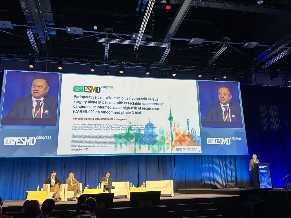 2025年10月19日欧洲肿瘤学会(European Society for Medical Oncology, ESMO)年会上,中国肝癌研究再度传来佳音。在复旦大学附属中山医院樊嘉院士的指导下,由周俭教授牵头的研究者发起的临床研究最新成果——“卡瑞利珠单抗联合阿帕替尼用于可切除肝细胞癌伴中高危复发风险患者的围手术期治疗:一项多中心、开放、随机对照2/3期研究(CARES-009)”正式发布。周俭教授受邀作大会报告,代表团队解读CARES-009研究结果,向国际同行分享中国肝癌围手术期治疗经验。作为全球首个在肝癌围手术期治疗III期研究中取得阳性结果的临床试验,其重磅数据一经发布,便引发全球关注。