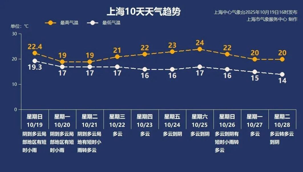 明天(10月21日)上海气温在17~19℃,风力依旧较大,大风天气会持续到周三前后。周三至周六申城基本是多云为主的天气,白天气温逐渐回升,昼夜温差较大,大家要注意及时调整着装,谨防感冒。