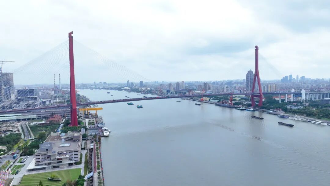 巨大的杨浦大桥桥身横跨黄浦江,