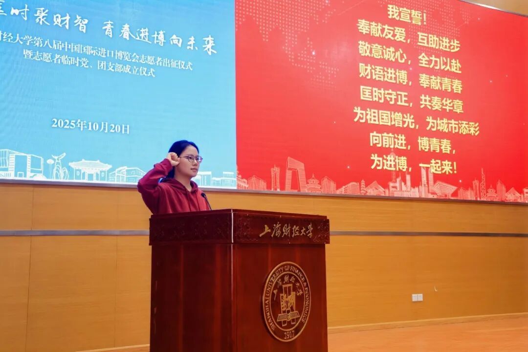 燃志愿热忱,赴进博之约。上财新一代“小叶子”将再次以昂扬的姿态投身于进博会的志愿服务中。第八届进博会志愿者代表章亦菲同学作为第八届进博会志愿者代表发言。她号召全体“小叶子”以“信念、纪律、协作、技术、学习”为行动准则,在世界级舞台上展现中国青年的专业形象与开放胸怀。她表示,上财学子将秉持“厚德博学,经济匡时”的校训精神,以专业服务贡献青春力量,以志愿行动传播进博精神。