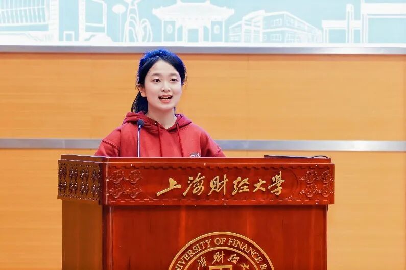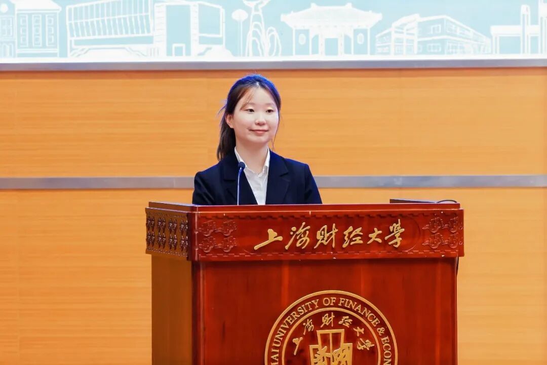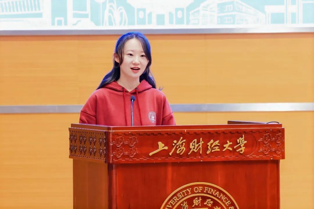 从“新叶”到“二年级小叶子”,身份在变,以专业服务传递上财青年温度的初心不变。2022级本科生时添作为志愿者代表,在仪式上分享进博服务的感悟与承诺:她回顾上财“小叶子”七年服务进博的动人故事,深感进博志愿的接力棒已握在手中。基于第七届的志愿服务经历,她深知志愿服务价值在于以专业能力传递青年智慧。面向未来,她代表全体志愿者承诺,将以专业服务宾客、以创新拥抱变革、以情怀践行使命,为进博盛会贡献上财青年的财智力量。