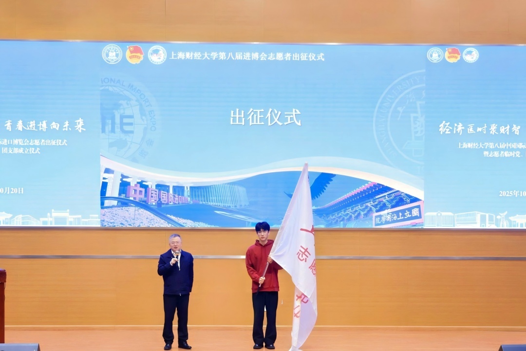 接过手中的旗帜,坚定心中的信念。仪式上,周国良副书记为第八届进博会志愿者代表王汝一同学授旗,并宣布出征。