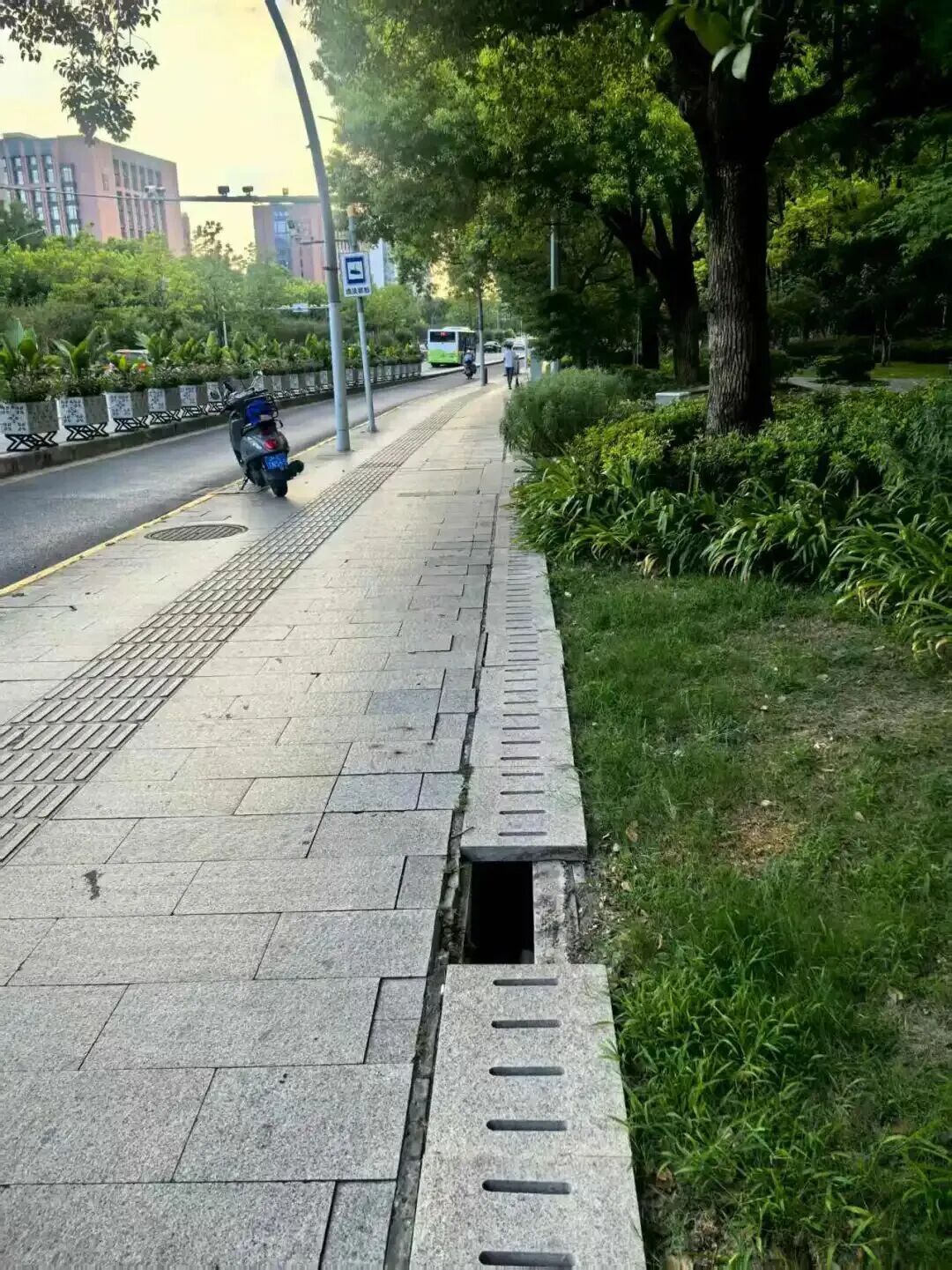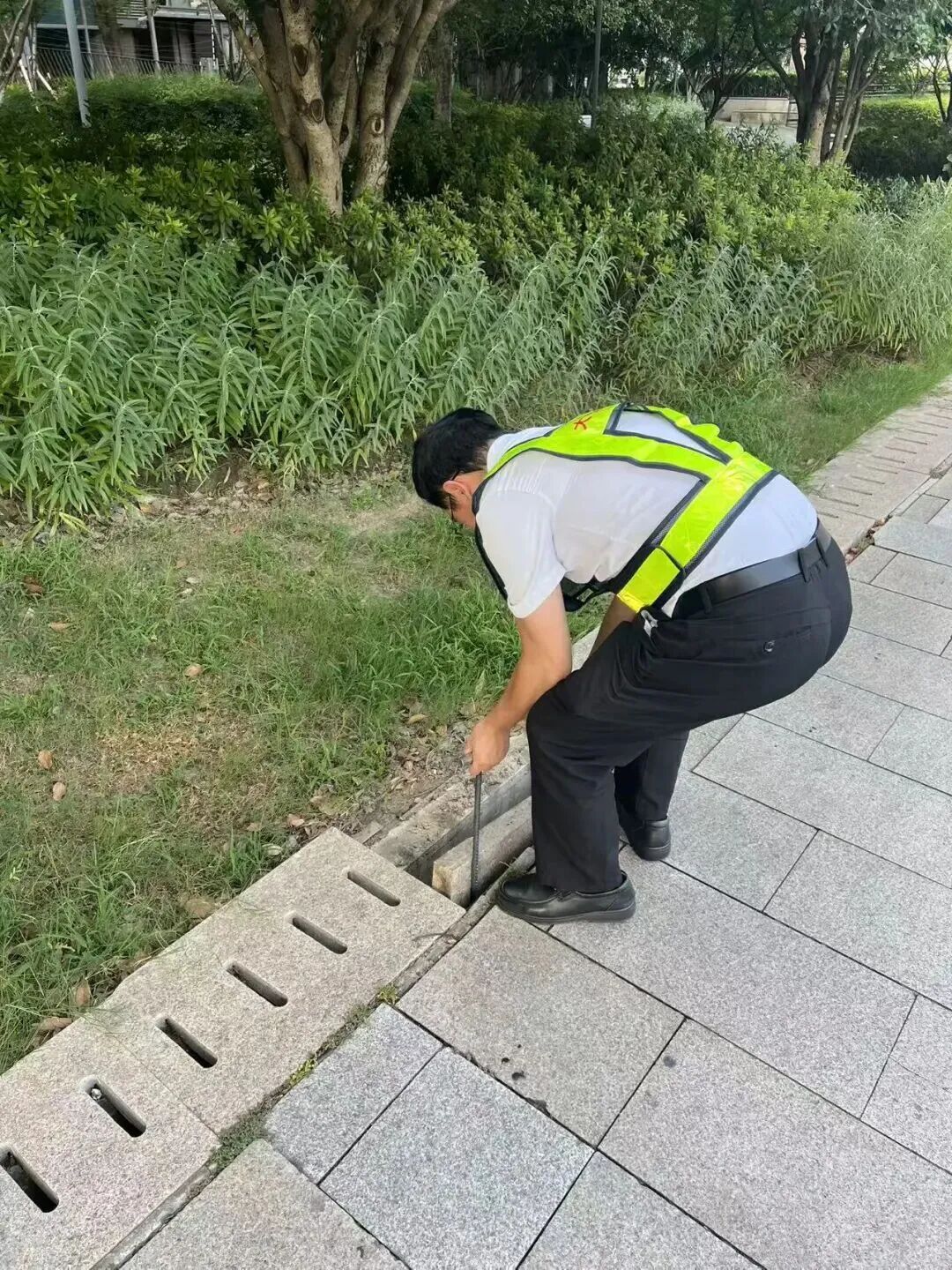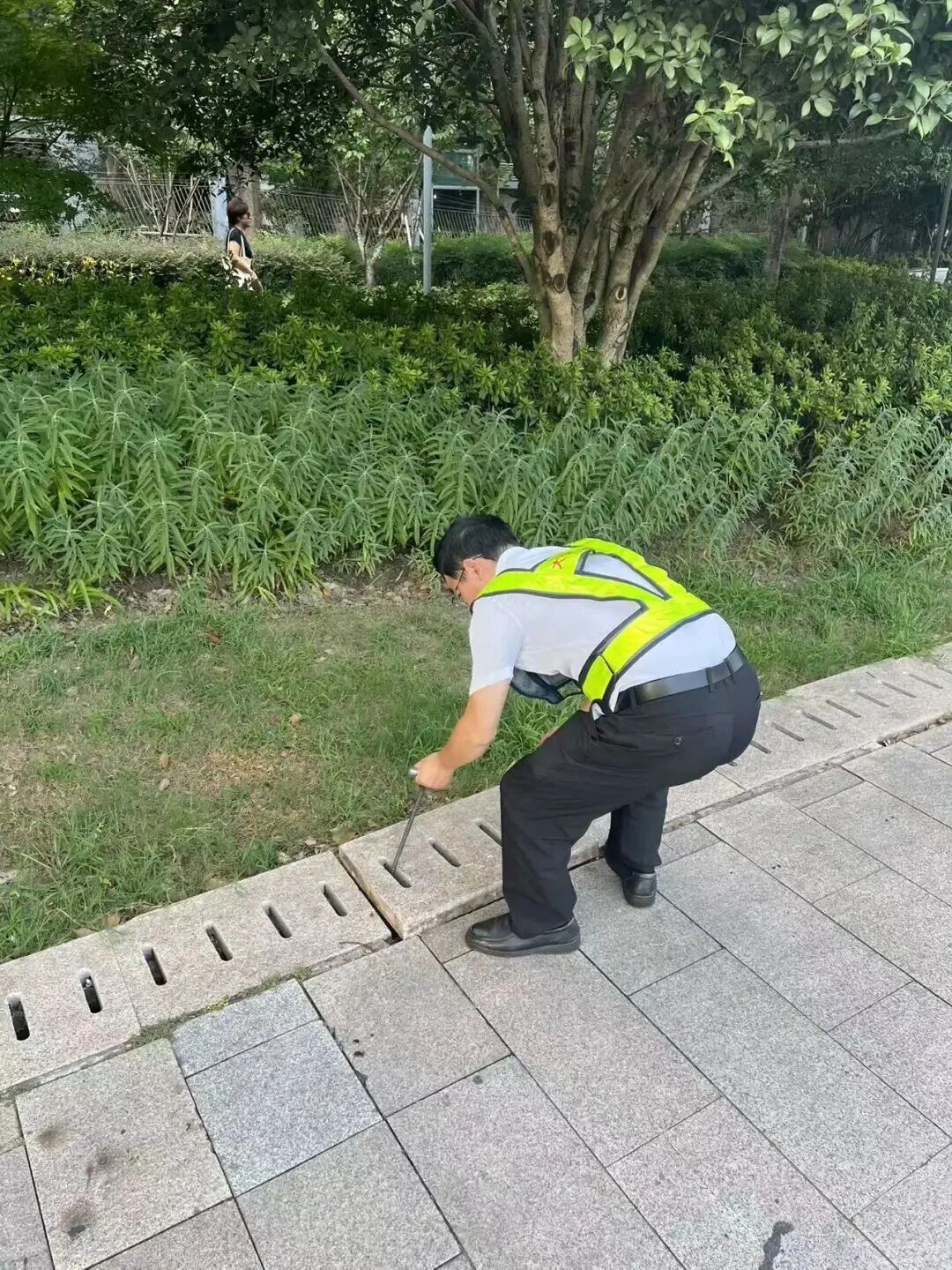 面对突发小问题,网格员迅速化身“现场办”专员,立即处置。在广中路北宝兴路西南角,一处雨水篦子完全脱落,形成一个约半米深的坑洞,对过往行人及车辆造成潜在危险。网格员发现该隐患后,立即在坑洞周边放置警示标志,提醒路人车辆绕行,随后从随身工具箱中取出钩子,俯身小心探入坑内,精准钩住篦子边缘,缓慢将其拖移复位,并反复确认其牢固平整,与周边路面齐平。整个过程不到十分钟,“马路陷阱”被迅速消除,道路交通恢复安全通畅。