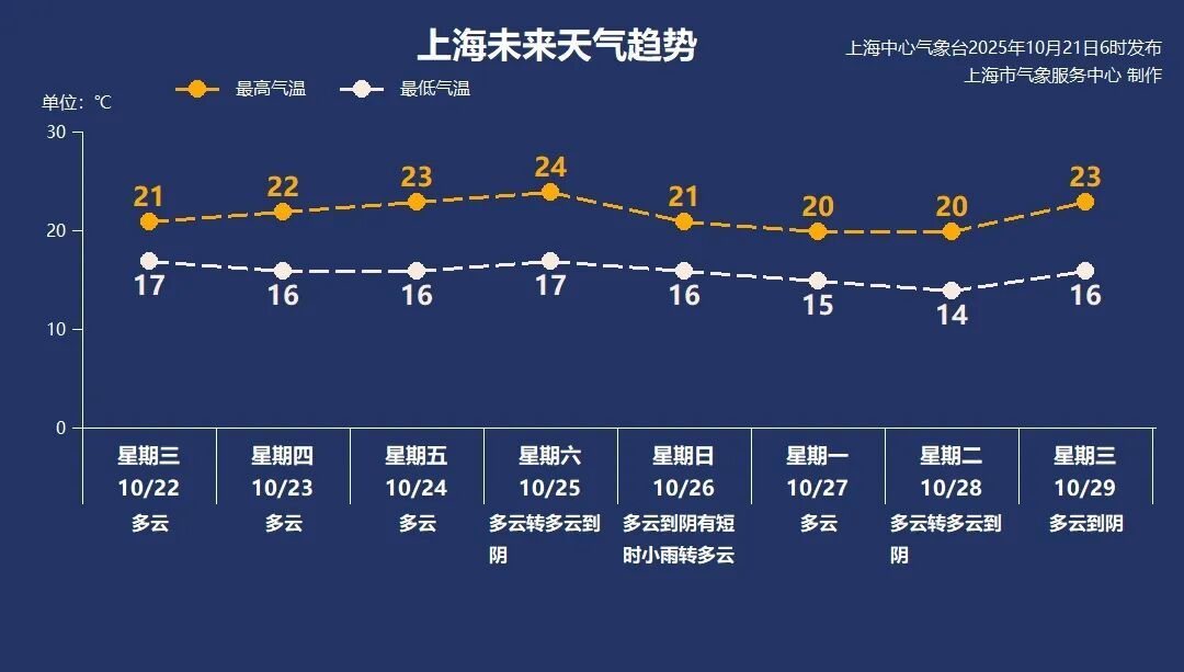 周三起天空状况转好,周四前后风力减弱,申城将迎来一段秋高气爽的天气。最高气温逐日回升,周六最高气温在24℃左右。早晚气温依旧较低,昼夜温差拉大,建议使用洋葱式穿衣法。周日前后受弱冷空气影响,气温略有下降并伴有弱降水。