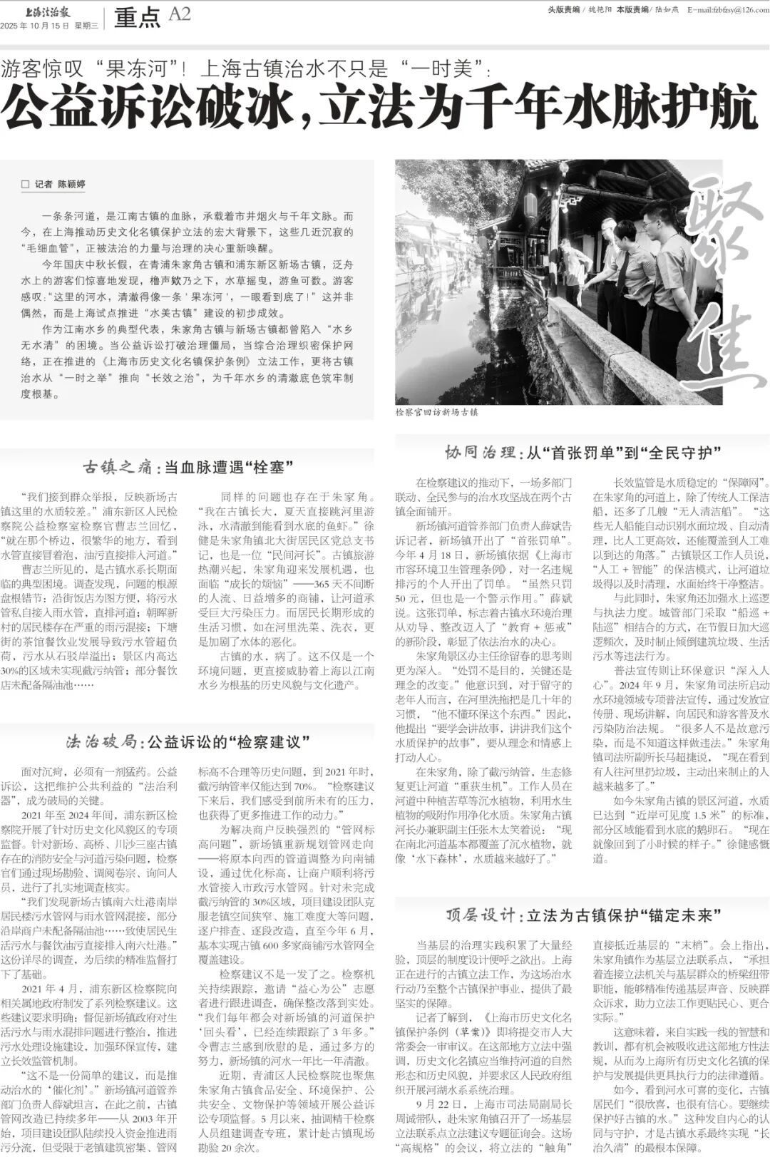 作为江南水乡的典型代表,朱家角古镇与新场古镇都曾陷入“水乡无水清”的困境。当公益诉讼打破治理僵局,当综合治理织密保护网络,正在推进的《上海市历史文化名镇保护条例》立法工作,更将古镇治水从“一时之举”推向“长效之治”,为千年水乡的清澈底色筑牢制度根基。