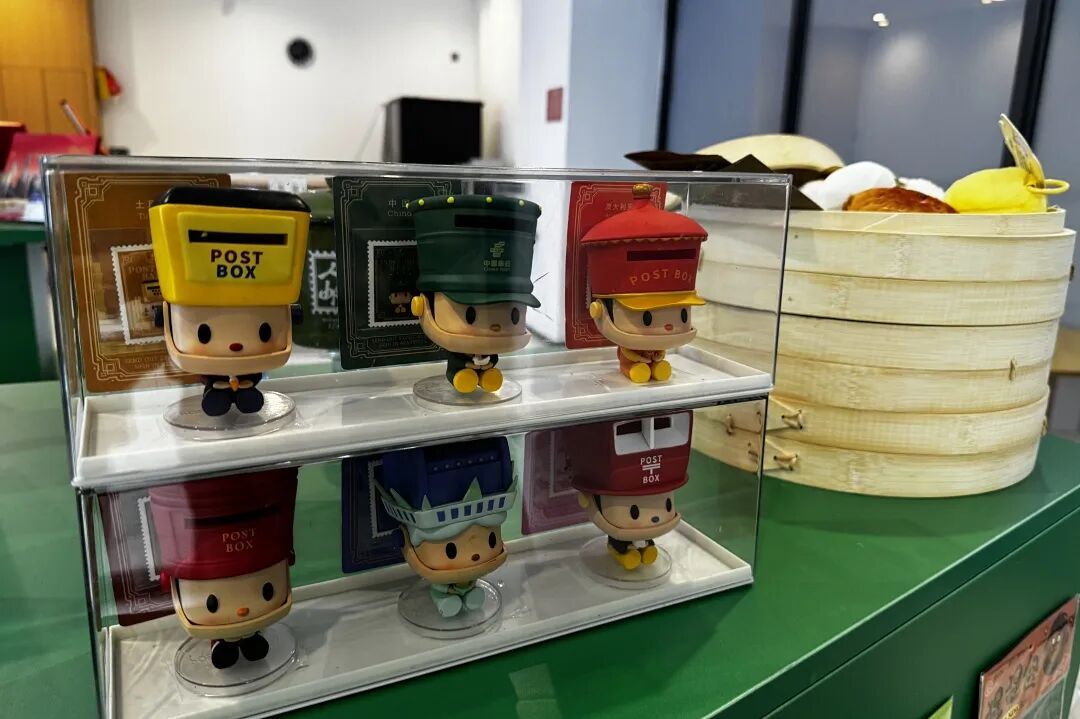 走进江浦路邮政所,最吸引人的并非传统的邮政服务窗口,而是充满创意的文创展示区。记者看到,与中华小吃联名的玩偶站在“蒸屉”里,如果有市民购买,工作人员将把玩偶巧妙地放置在定制的纸袋中,麻团、豌豆黄等造型可爱又富有生活气息。