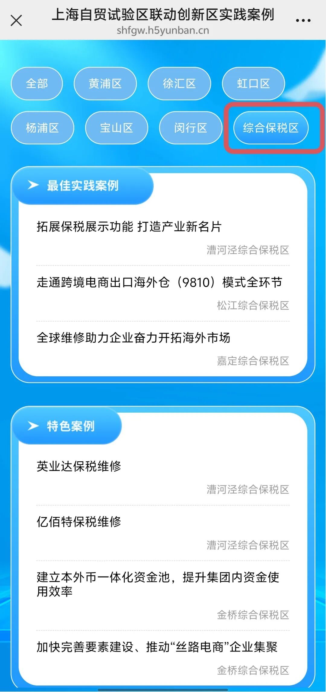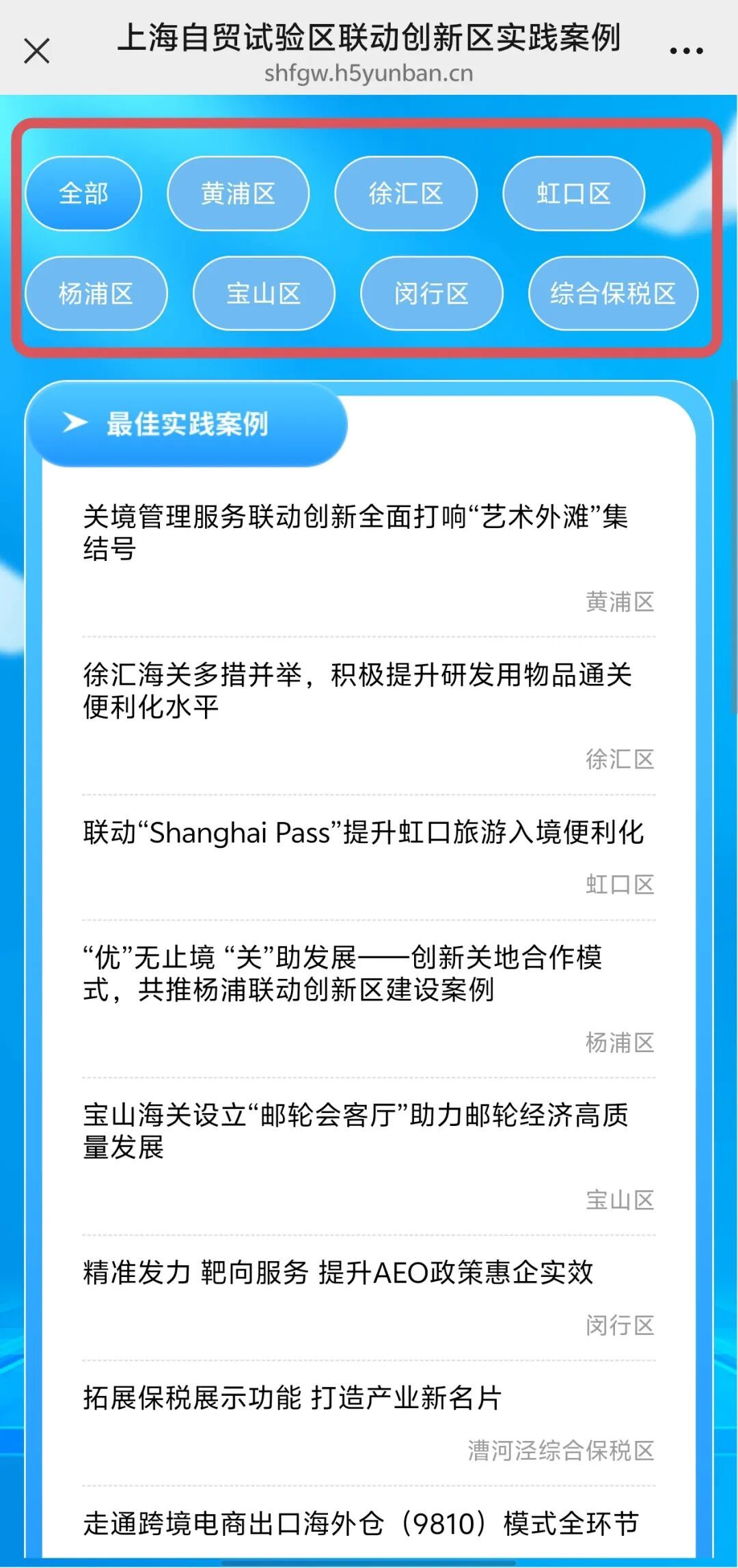 可按区域进行了筛选,包括黄浦区、徐汇区、虹口区、杨浦区、宝山区、闵行区、综合保税区等,点击相应区域,可查看对应的最佳实践案例和特色案例。