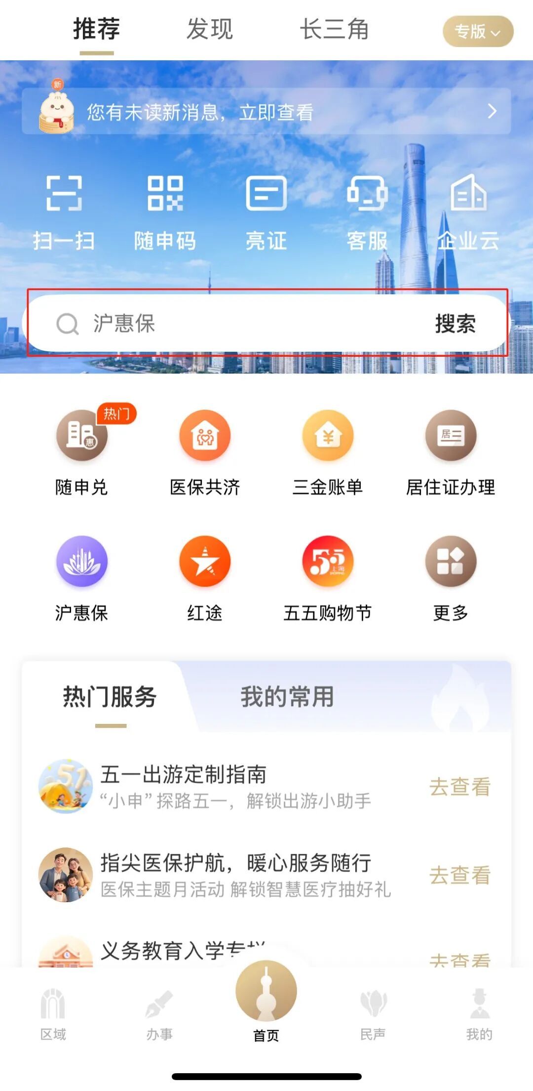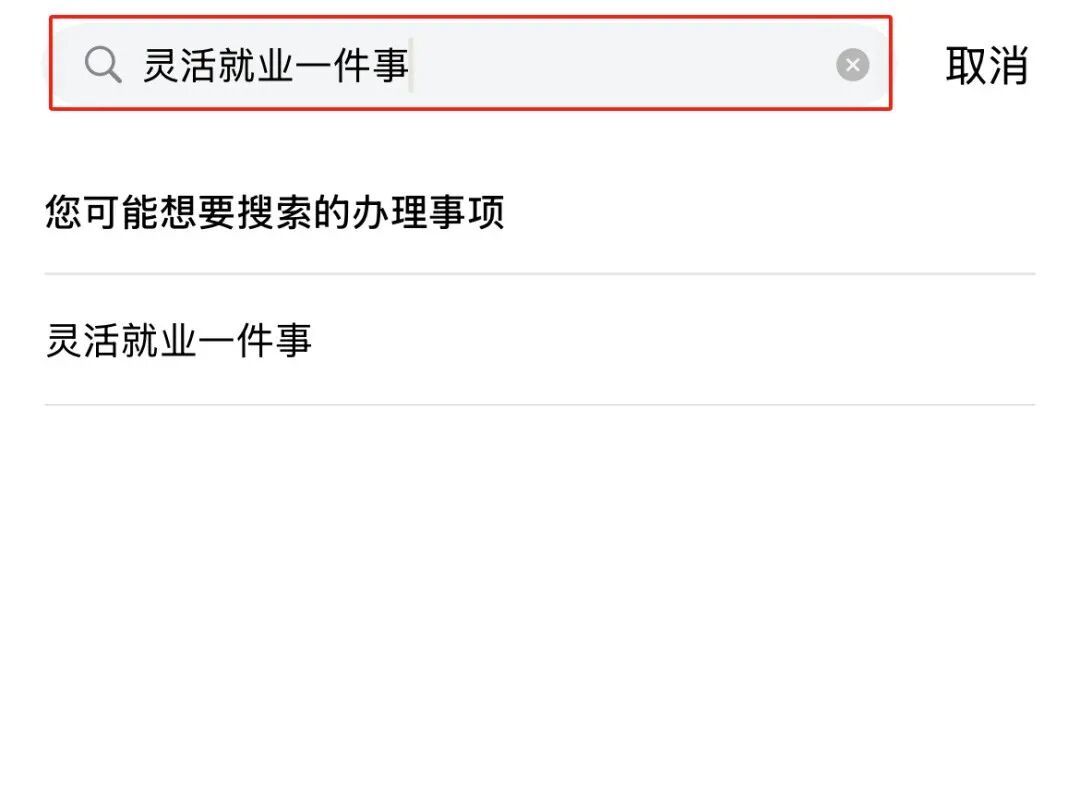 登录“随申办市民云”App,找到位于上方的搜索框,输入“灵活就业一件事”并点击搜索。