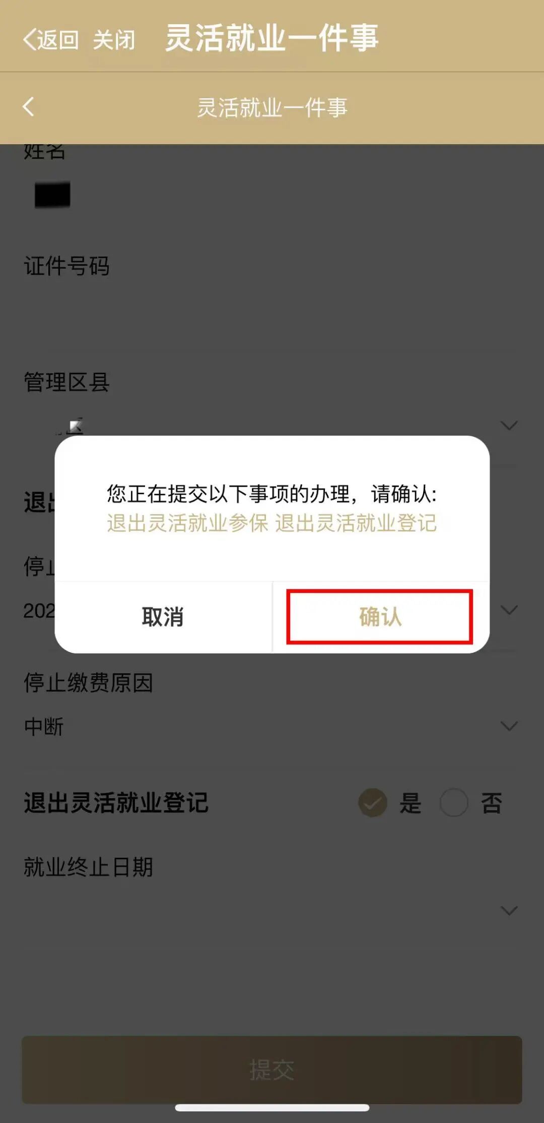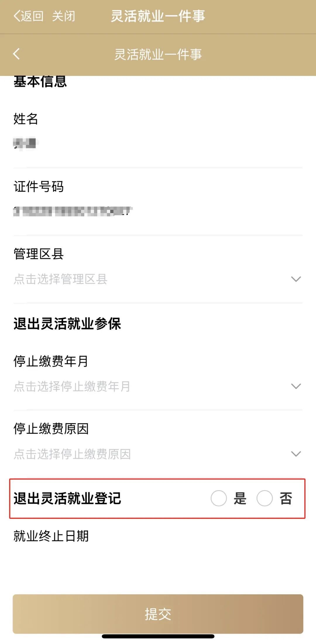 停止缴费信息核对无误后,还需确认是否同步退出灵活就业登记,并在“退出灵活就业登记”栏目选择“是”或“否”,选择完成后点击“提交”。