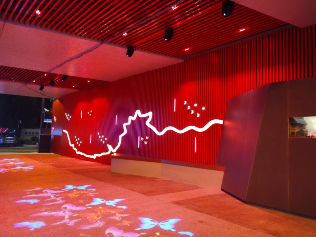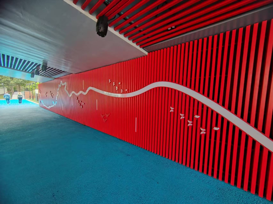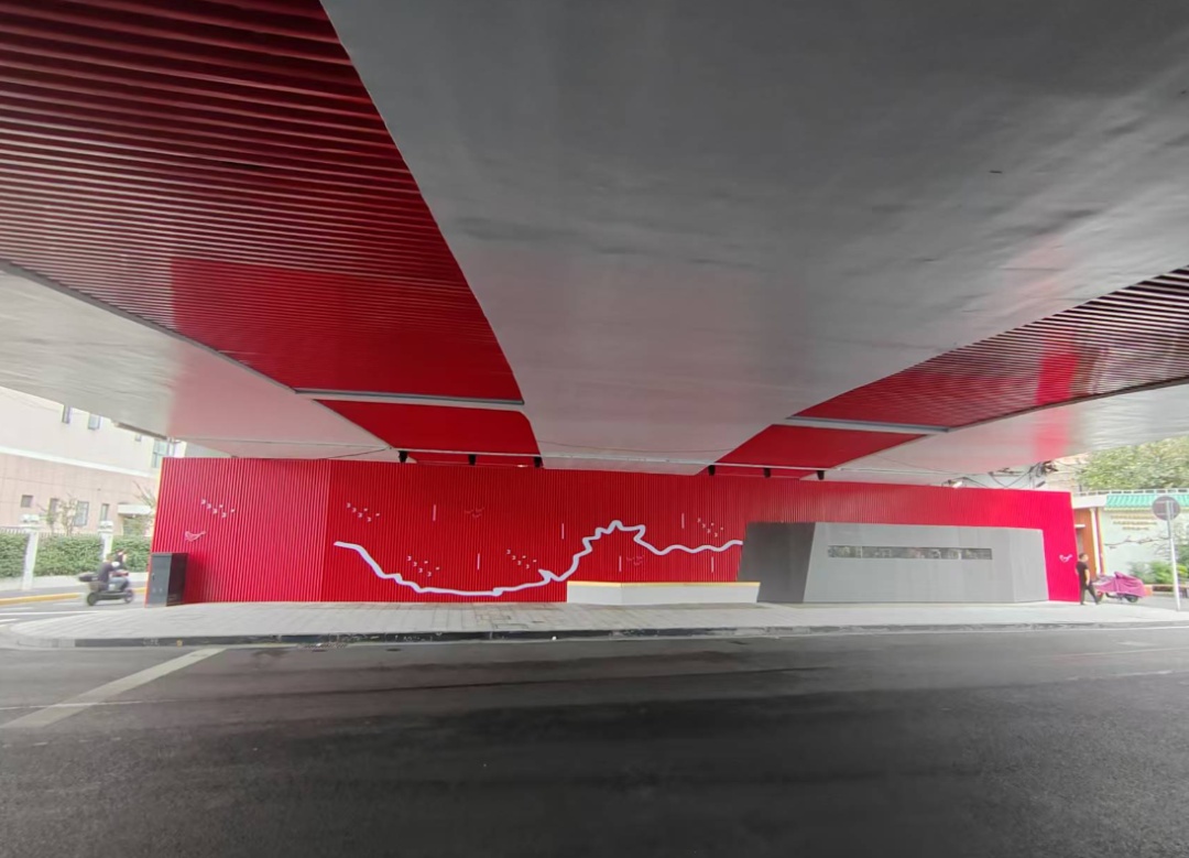 桥下人行道南侧原有停车场栅栏装置被拆除,释放出部分停车场空间,原人行道北侧的城市文化宣传橱窗被移至人行道南侧,并在南侧增设艺术造型休憩座椅,增加停留休憩、观赏玩耍的功能。同时,在南北两侧以红色格栅结合蝴蝶造型元素装饰墙面,并以同色格栅吊顶遮挡顶部暴露在外的大桥钢结构,既有效弱化了压抑感,又美化了顶面。