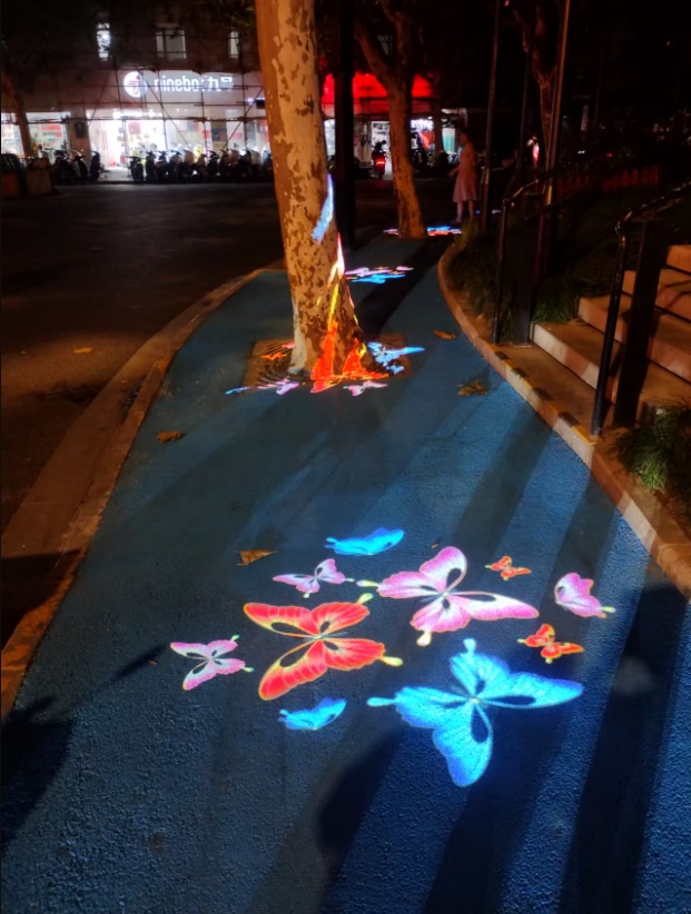 为了与相邻的石门二路街道蝴蝶湾党群服务阵地相呼应,无处不在的“蝴蝶”元素被巧妙绣入桥下空间肌理:从大桥阶梯侧面的造型灯饰到桥下墙面装饰,从绿道路面投影到立面灯光设计,处处都是蝴蝶的影子,就连两侧绿地里也悄悄藏了蝴蝶造型的LED灯和小品装饰。