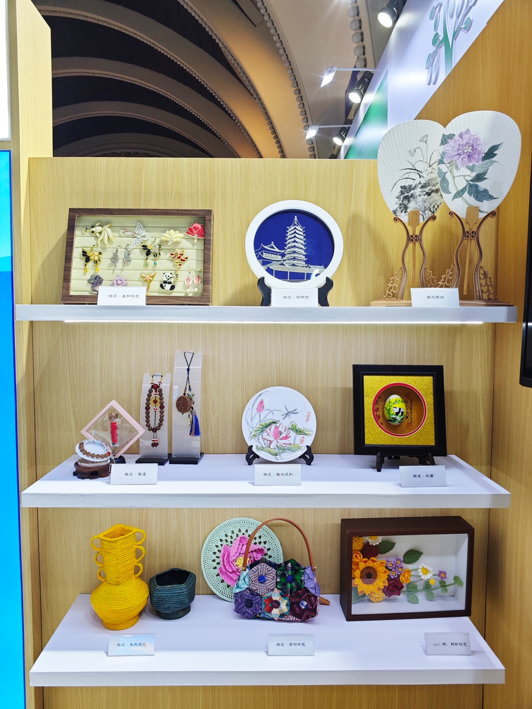 展台内,通过九宫格的形式陈列了“秸秆绣”“朱氏绳艺”“海派瓷刻”等非遗手工类课程作品,区域特色鲜明,吸引众多老年观众驻足欣赏。