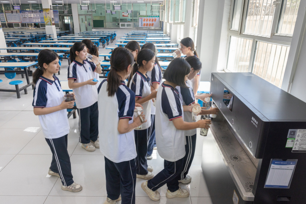 如今,莎车县第一中学5个校区配15台设备,覆盖食堂、宿舍,一台可保障150人饮水。“通用净水还帮我们重新布线、解决电压问题,前端难题全搞定。”蔡军温说,学生喝自来水的现象几乎绝迹。高二学生古丽格娜·艾力算“小账”:“以前喝桶装水每月花5元,现在设备就在宿舍旁,随到随取,水质好还免费。”
