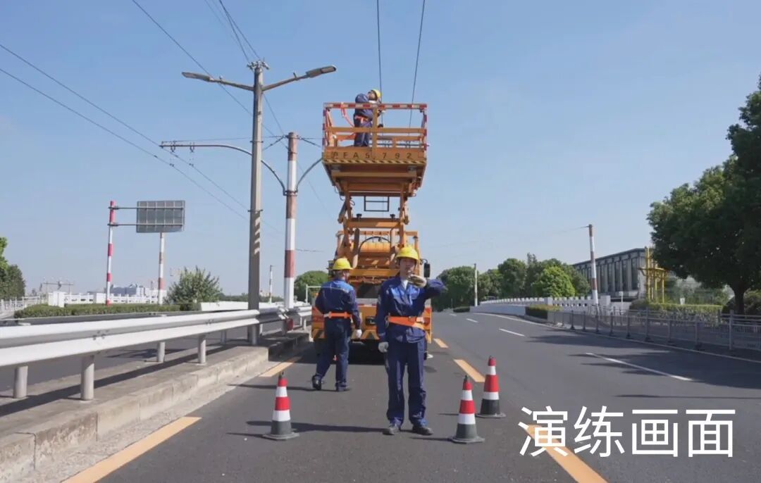 演练模拟一辆71路进博专线中运量公交由P5停车场开往黄陂北路时,突发架空线故障,接电器卡线导致车辆无法继续行驶,可能影响会展中心核心接驳线路运行。驾驶员立即启动车载一键报警功能,连接公交进博申昆路指挥中心。随后切断高压总电源,开启双闪警示灯,放置三角警示牌,并打电话给站点管理人员,说明情况,等待抢修。
