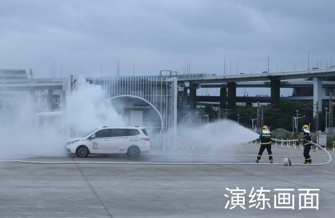 演练模拟国家会展中心P7停车场内,停车场工作人员和消防人员联合巡逻时,发现一辆新能源轿车突然从底盘处冒出白烟,火势可能波及停车场内其他停放的车辆。