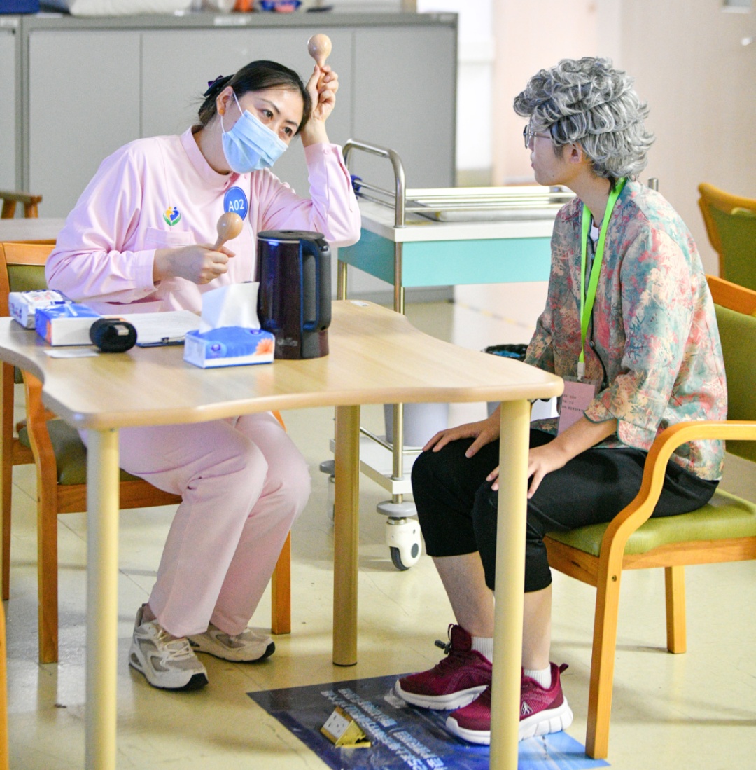 “已经3点了,我要去上班了。”在赛场上,面对认知障碍“老人”考官的“刁难”,1号参赛选手吕勤面带微笑,却并未立刻跟老人“讲道理”,而是温柔地说:“奶奶好的,等我们稍微休息一下,别急,稍后我陪您去上班。”吕勤用丰富的职业经验和专业知识,最终让“老人”明白了“现在是上午10点,我已经退休了,不用去上班了”这个事实。