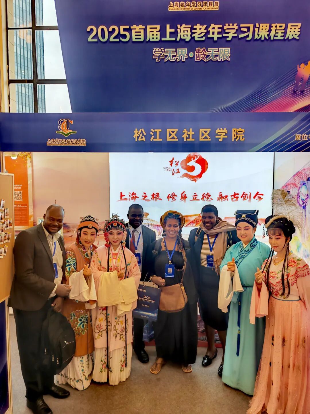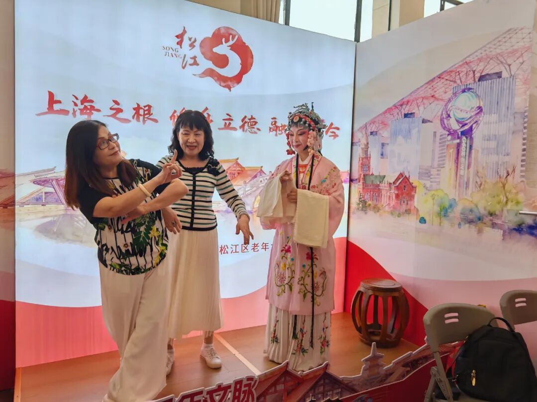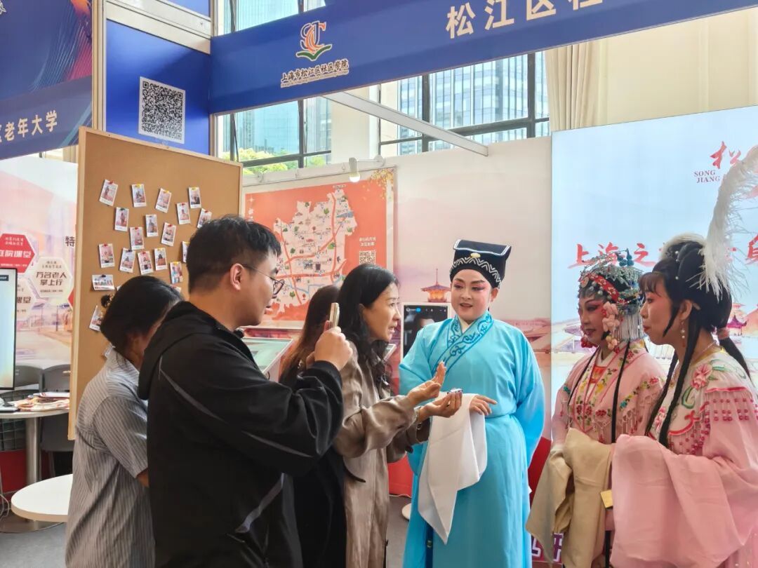 “请问这是中国的什么戏曲?他们唱得真好听!”松江区老年大学展区前,数位外国友人被精彩的越剧表演吸引,驻足欣赏间,还有人好奇提问,邀约演员合影留念。展区内特设的互动小舞台成为焦点。只见,来自松江区老年大学越剧团的学员们身着华服,演绎《梁祝》等经典唱段。婉转的唱腔、飘逸的水袖,引得市民驻足跟唱、登台切磋。
