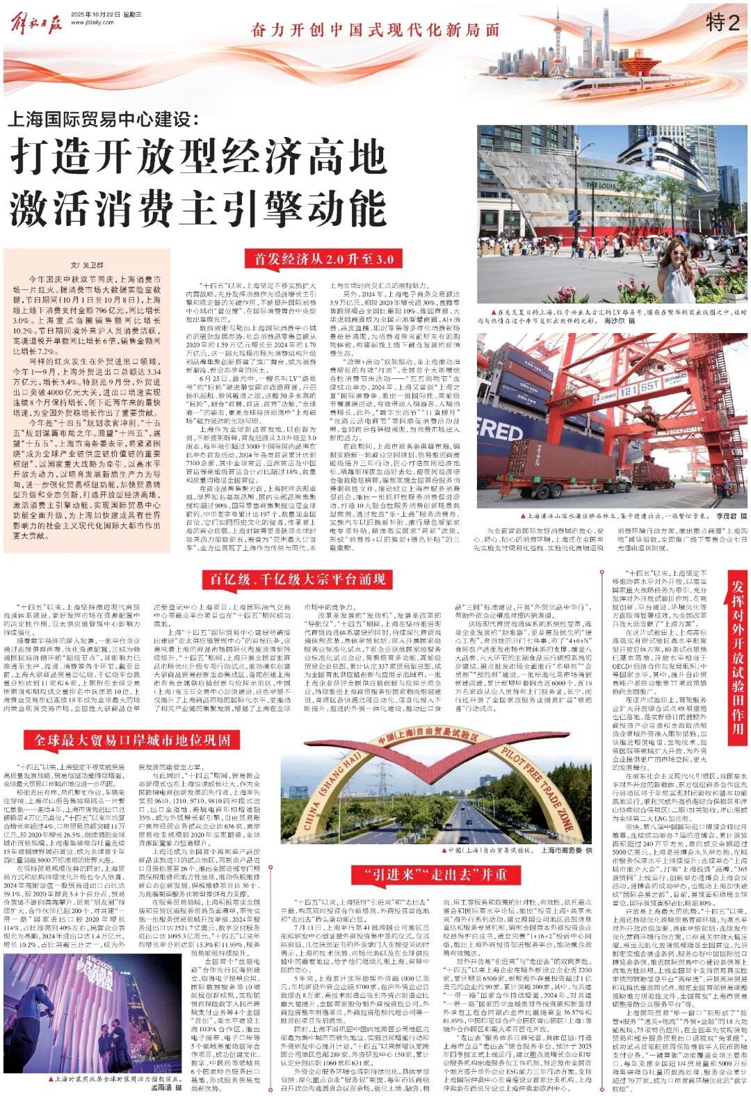 “十四五”以来,上海坚定不移推动高水平对外开放,以落实国家重大战略任务为牵引,充分发挥对外开放试验田作用,在制度创新、平台建设、环境优化等方面取得显著成效,为全国改革开放大局贡献了“上海方案”。在这片试验田上,上海高标准落实自贸试验区高水平制度型开放总体方案,80条试点措施已基本落地,开放水平相当于OECD(经济合作与发展组织)中等国家水平。其中,提升自由贸易账户系统功能等77项政策措施向全国推广。在这片试验田上,首轮服务业扩大开放综合试点89项措施也已落地,落实新修订的鼓励外商投资产业目录和全面取消制造业领域外资准入限制措施,加快推进增值电信、生物技术、独资医院等领域扩大开放,为外资企业提供更广的市场空间、更大的发展舞台。在浦东社会主义现代化引领区,我国高水平对外开放的新载体、东方枢纽商务合作区先行启动区将于年底实现封闭验收和基本功能落地运行。顺利完成外高桥港综合保税区和洋山特殊综合保税区(二期)封关验收,洋山港成为全球第二大LNG加注港。很快,第八届中国国际进口博览会将拉开帷幕。连续成功举办7届的进博会,累计展览面积超过240万平方米,意向成交金额超过5000亿美元。上海是进博会永久举办地,在城市服务保障水平上持续提升:连续举办“上海城市推介大会”,打响“上海投资”品牌,“365展贸网”上线运行,创新举办进博会上海会议活动。进博会的成功举办,也推动上海加快建成“国际会展之都”,目前,展览面积稳居全球首位,国际展览面积占比稳超80%。开放是上海最大的优势。“十四五”以来,上海还持续优化跨境贸易营商环境,为高水平对外开放添柴加薪。具体举措包括:连续发布优化营商环境行动方案,口岸通关时效大幅压缩,海运无纸化放货规模稳居全国首位。先后制定实施会展业条例、服务办好中国国际进口博览会条例、推进国际贸易中心建设条例等上海地方性法规。上线全国首个支持贸易真实性审核的辅助信息平台“离岸通”,开展离岸贸易印花税优惠政策试点。制定全国首部贸易调整援助地方规范性文件,全国首发“上海市贸易调整援助公共服务平台”等。上海国际贸易“单一窗口”则形成了“监管+服务”“通关+物流”“外贸+金融”的18大功能板块、75项特色应用,在全国率先实现货物贸易和部分服务贸易出口退税双“免填报”,成功试点首笔航贸再保险费数字人民币跨境支付业务,“一键算碳”功能覆盖全球主要港口,每年支撑全国超1/4贸易量和5000万标箱集装箱吞吐量的数据处理,服务企业累计超过70万家,成为口岸营商环境优化的“数字底座”。