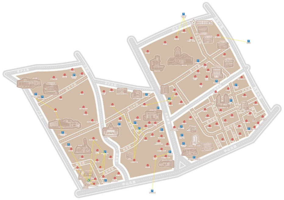 街道组织4个网格开展“地毯式”摸排,不仅覆盖辖区内的居住区、园区、楼宇,还将高架下匝道、道路停车场等公共资源纳入统计。地图上红色标记是居民区,蓝色标记是园区、楼宇,黄色连线是已经达成合作的“停车联盟”。