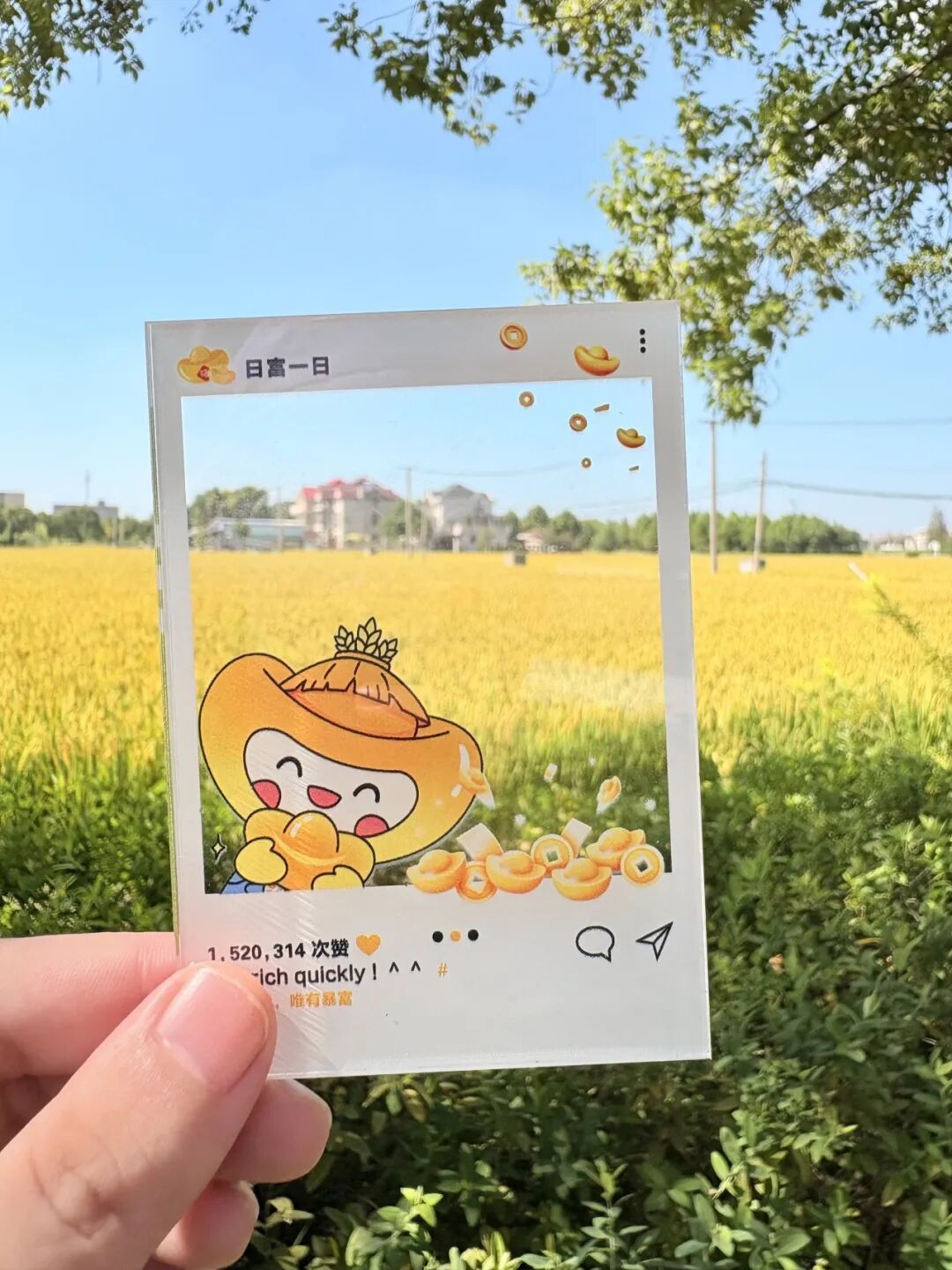 嘿~你好! 你手里的这张透明小卡片 可不是普通的pvc小卡 而是一份 专属打卡神器 在宝山罗泾,有了它 随时随地都能和罗泾镇首个IP形象“泾灿灿”一起 玩转光影 串联四季美景 GO “透”一下 “框”住四季“泾”彩 3寸的透明卡片 打破时空和次元的界限 将现实的场景和萌动的“泾灿灿”相连 方寸之间 自有无限的创意天地 等你定格 咔嚓拍灿 恭喜发灿 心有所灿 等6张透卡陪你轻松逛罗泾 透卡这样玩 带上“泾灿灿”游罗泾 Step1:锁定“氛围感”秋景 千亩良田翻涌着金色稻浪,像给大地铺上了毛绒绒的毯子;百果园里的脆柿、蜜梨挂满枝头,等着和你贴贴;耕织园内古老纺车吱呀转动,编织着农耕文明的千年记忆;老榆树静静伫立村口,自带跨越百年的时光滤镜;瑞隆蔬果专业合作社连片蔬菜勾勒出绿油油的收获海洋…… 秋天的罗泾,不用你去刻意留意,每一步都是风景,每一眼都是韵味,随便挑个你喜欢的地方,透卡大片就已经完成99%! GO Step2:举起透卡,召唤“泾灿灿” 把透卡举起来,用透明的部分对准想拍的场景,让可爱的“泾灿灿”与美景同框。乖巧站立的TA,在罗泾自由又自在。 GO Step3:旋转挪动找C位 别急着按快门!转一转,扭一扭,挪一挪,把透卡上的“泾灿灿”对准真实稻田,或让“泾灿灿”的笑脸和夕阳重叠……相信你的脑洞,一定能给留下最完美的“灿生照片”。 GO Step4:咔嚓!拍下照片 朋友圈点赞+1+1+1 倒计时3、2、1——按下快门!恭喜你,成功get一张能刷爆朋友圈的大作! GO TIPS 拍照时可以尝试不同光线,会有意想不到的效果哦~ 拉上家人好友一起摆pose,把快乐加倍定格! 透卡中的世界绚丽多彩 那是“泾灿灿”的家乡秋意正酣 心动不如行动 即刻出发宝山罗泾 一起与秋风并肩 定格下秋天的美好故事吧