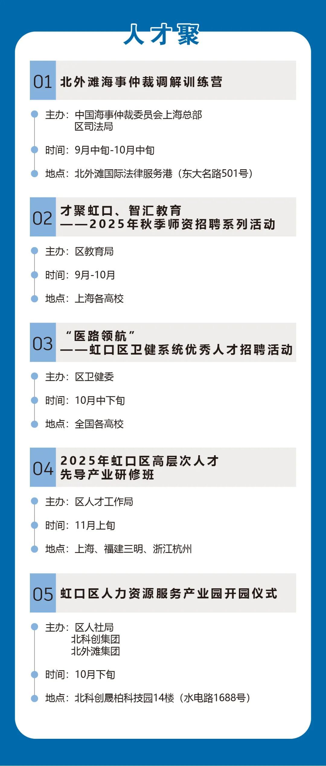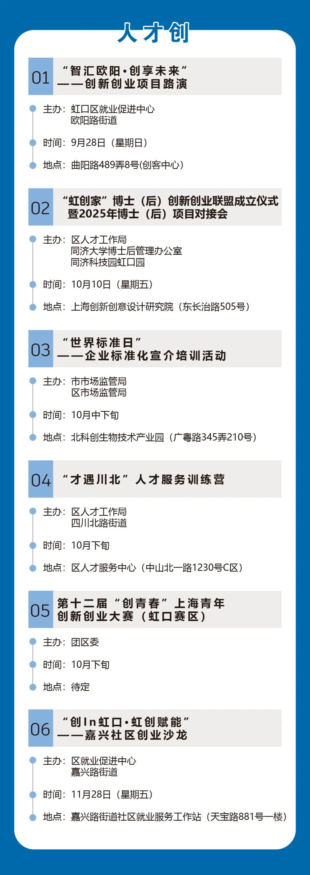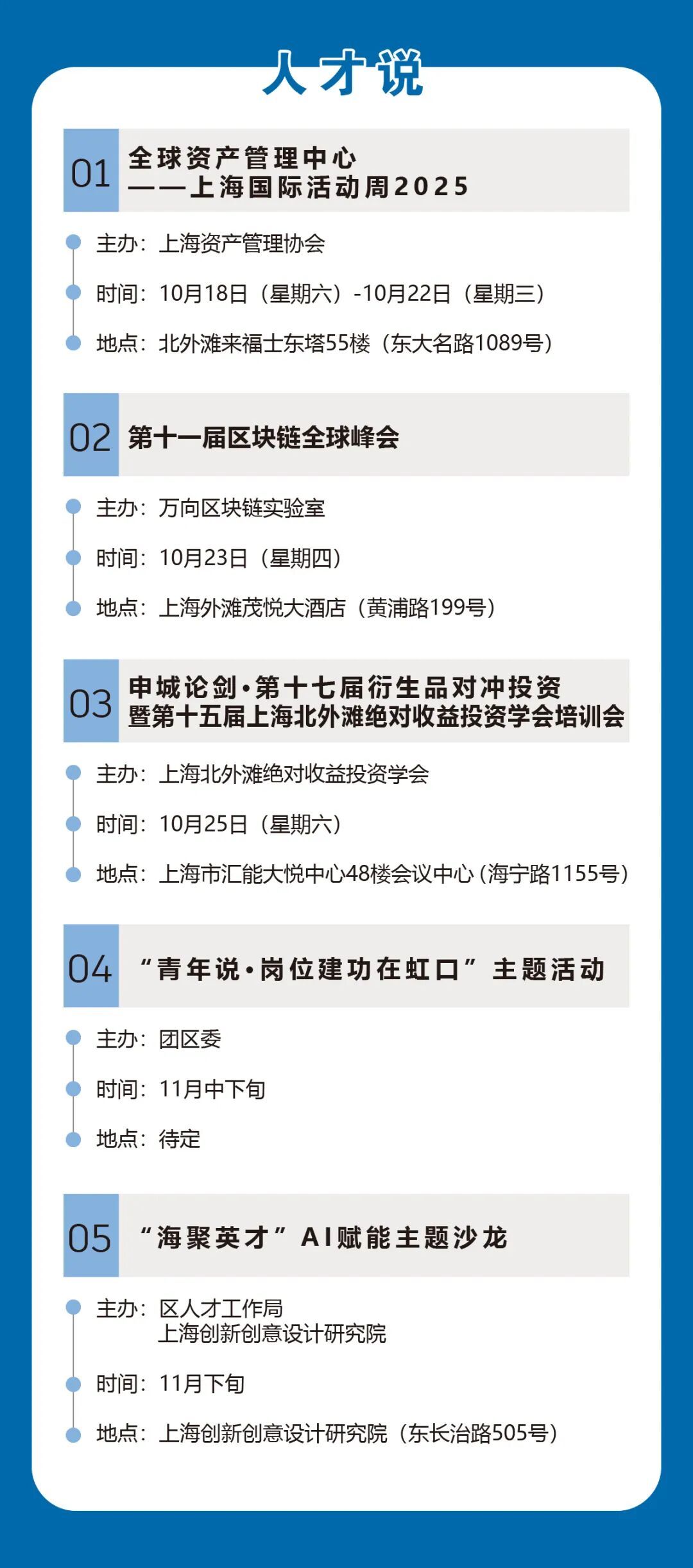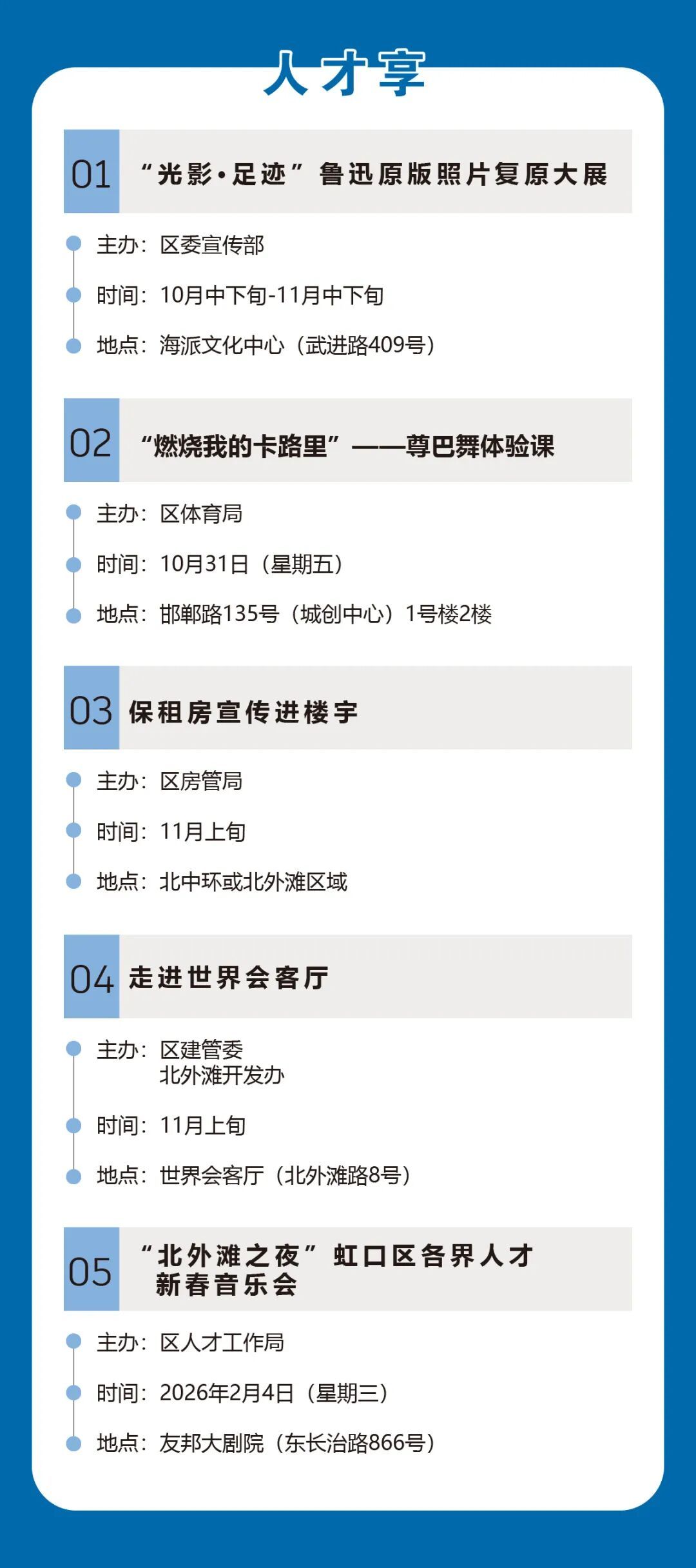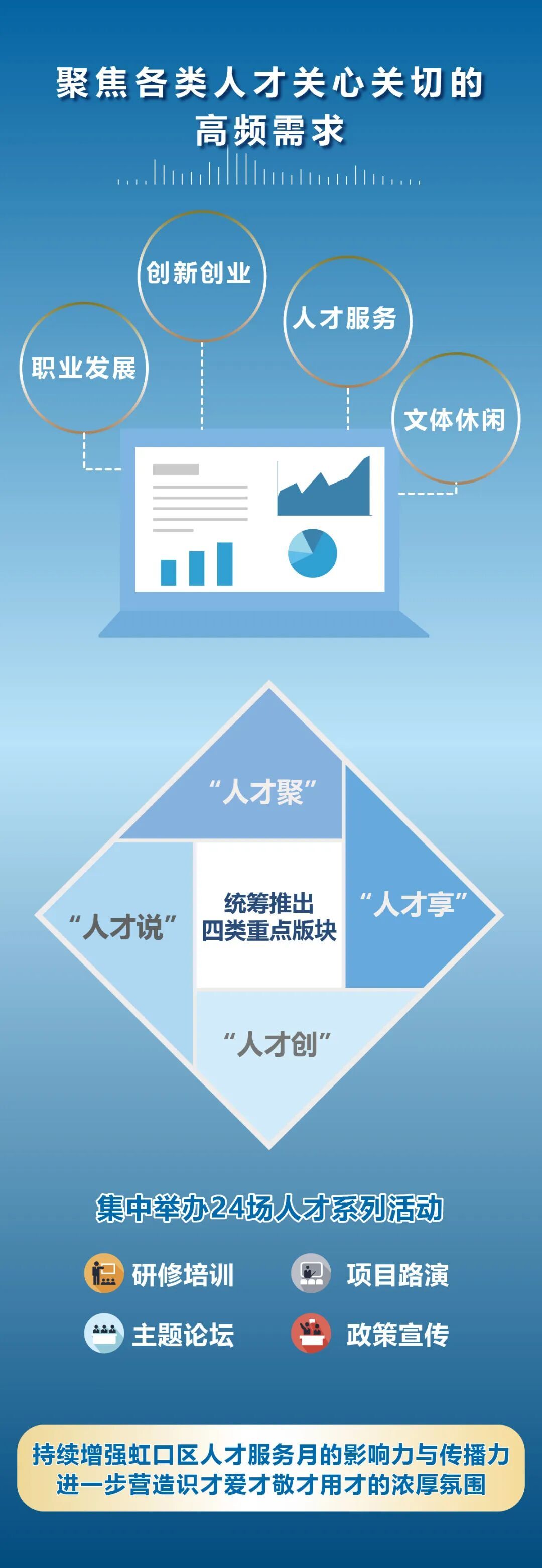 虹口区第三届人才服务月将于10月25日开幕。区委人才工作领导小组成员单位以及各街道立足人才多元需求,整合优势资源,精心策划了38场人才主题活动。