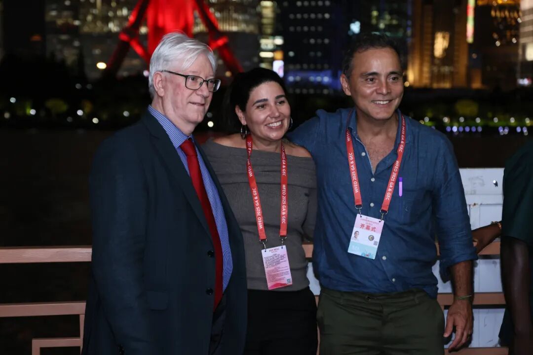 晚上的黄浦江两岸上演着世界级的灯光秀,当载满WFEO嘉宾的游船行进至东方明珠大转弯处,浦东震旦大厦的外墙上闪起了“2025WFEO GA & GEC”的字样。外宾们争先恐后地摆好了造型,留下了精彩的一幕。