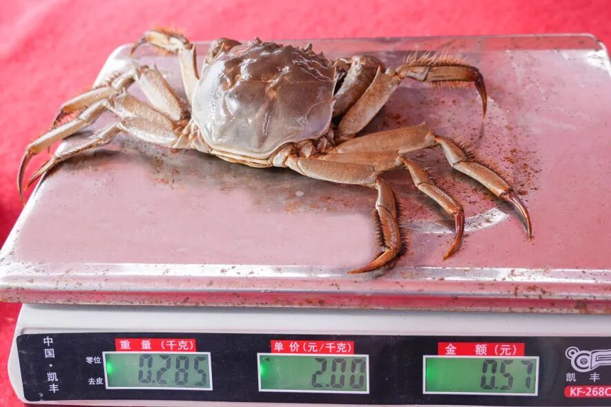“大家动作轻一点,按公母、大小分开装,别磕着蟹脚!”养殖人员汪兴瑜一边指挥分拣,一边难掩喜色地介绍:“为了保证品质,刚捕捞的螃蟹要先检验成熟度,再逐一过秤,母蟹单只在4两至半斤之间,公蟹普遍在半斤以上,大的可达7两左右。”