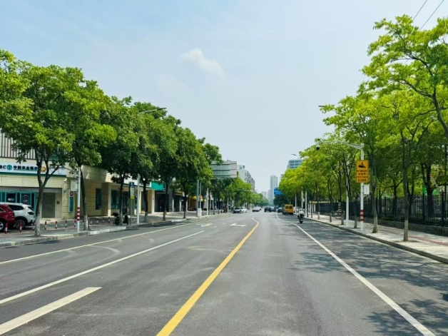 华科东路作为景观道路,不仅需要满足日常通行功能,更需与周边环境相融合。工程选用4cmSBS-13+8cmAC-25(掺0.35%抗车辙剂)沥青混凝土结构,该材料不仅耐久性强,能长期保持路面结构稳定耐久,其细腻的纹理和均匀的色泽视觉上更显整洁美观,实现实用与美观双重提升。