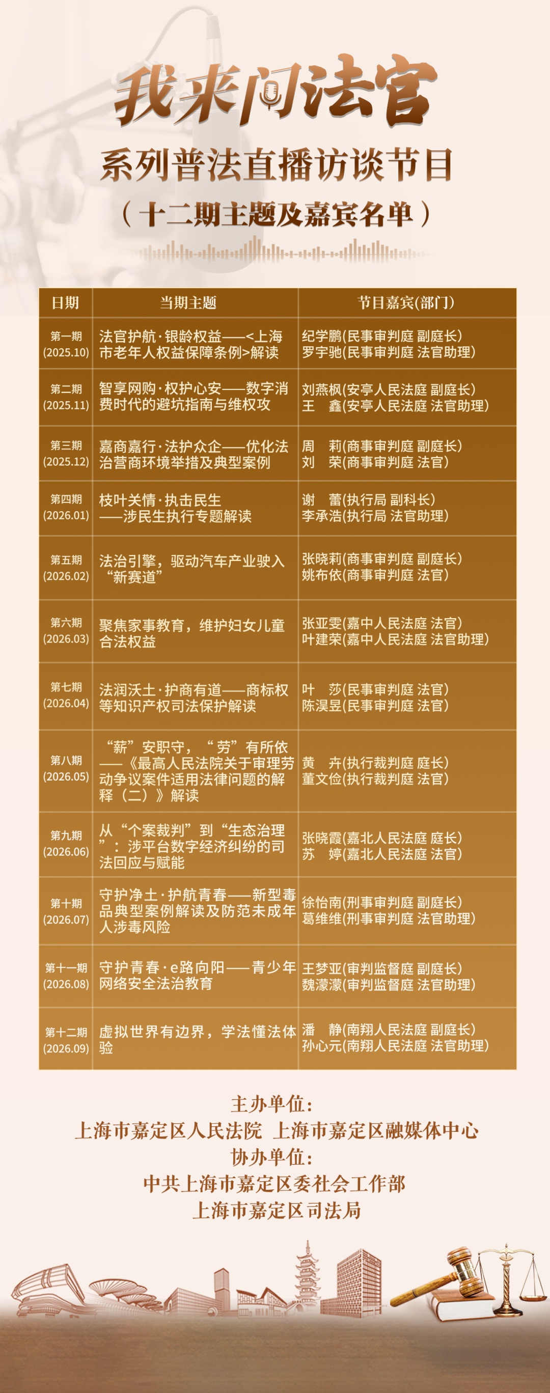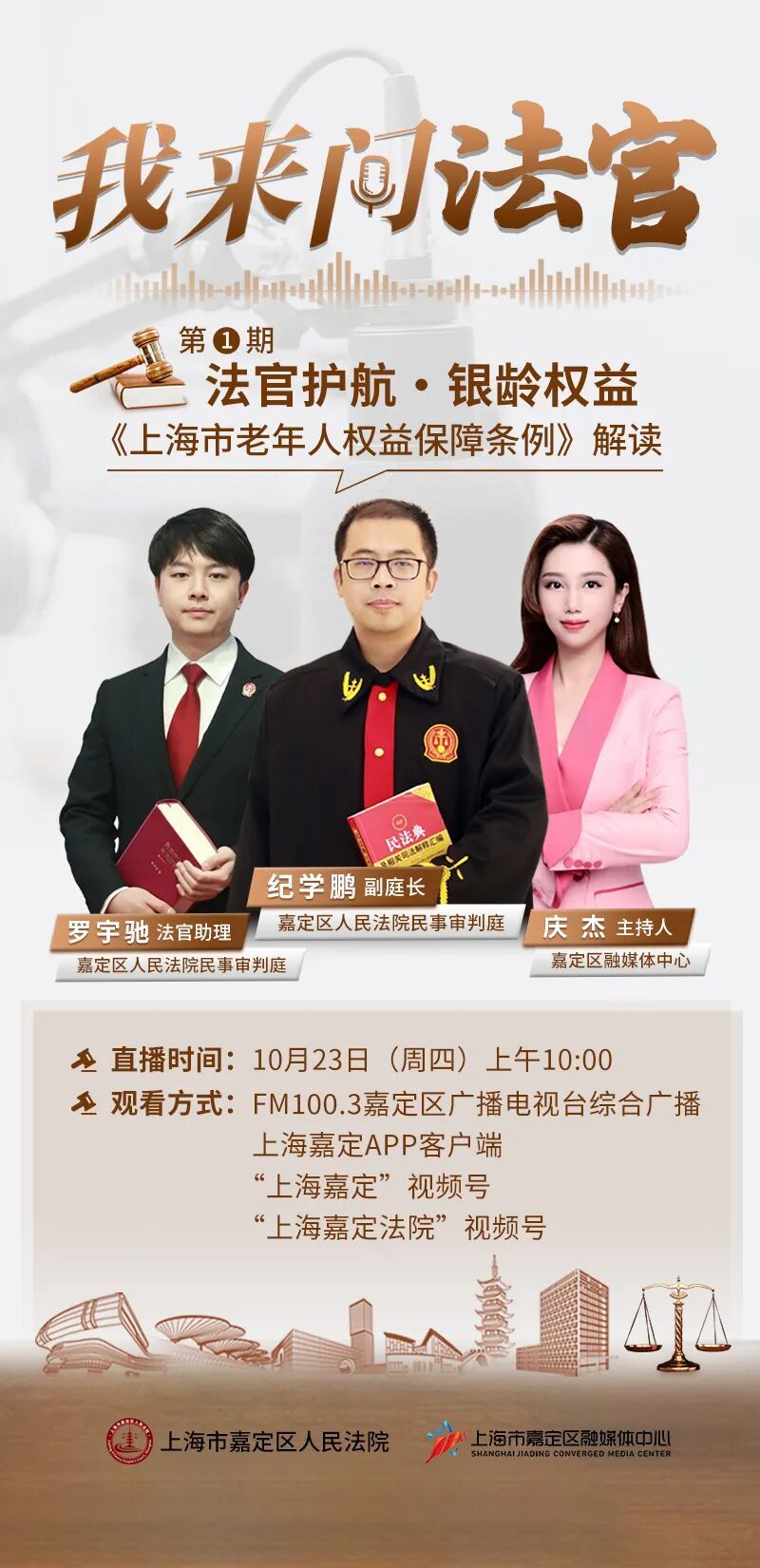 为深入推进“普法惠民”工程,把专业法律知识转化为群众听得懂、用得上的生活指南,上海市嘉定区人民法院与嘉定区融媒体中心合作,推出系列普法直播访谈节目——《我来问法官》。