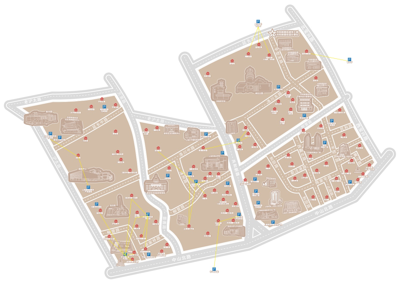 “一张图”,即共和新路街道停车联盟地图。街道组织4个网格开展“地毯式”摸排,不仅覆盖辖区内的居住区、园区、楼宇,还将高架下匝道、道路停车场等公共资源纳入统计。地图上红色标记是居民区,蓝色标记是园区、楼宇,黄色连线是已经达成合作的“停车联盟”。值得一提的是,地图上还标注了邻近的静安区芷江西路街道、大宁路街道、虹口区广中路街道的3处跨区域停车场,资源实现“一盘棋”调动。目前,地图已收录32处停车资源,未来将随“停车联盟”的壮大持续更新,为后续智慧化管理提供数据支撑。