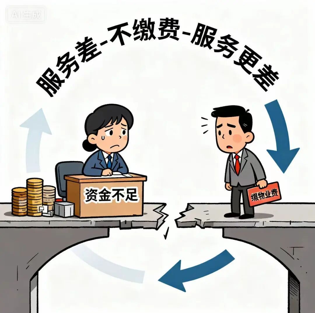 物业公司因资金不足而减少服务,业主因服务质量下降更不愿缴纳物业费,双方信任破裂,沟通困难,最终可能陷入“服务差-不缴费-服务更差”的恶性循环。